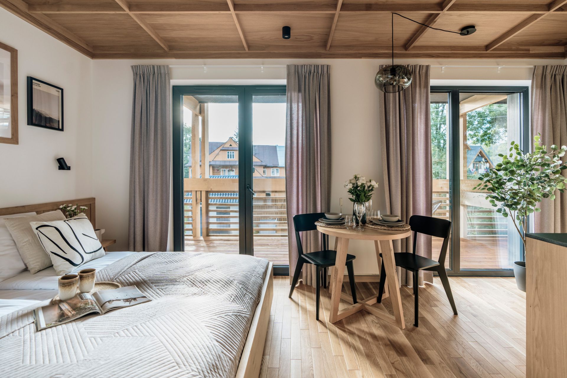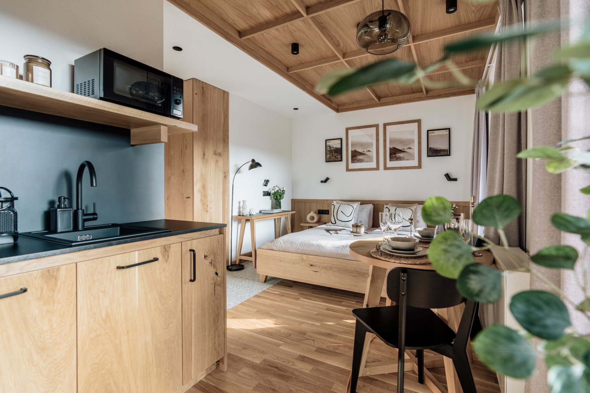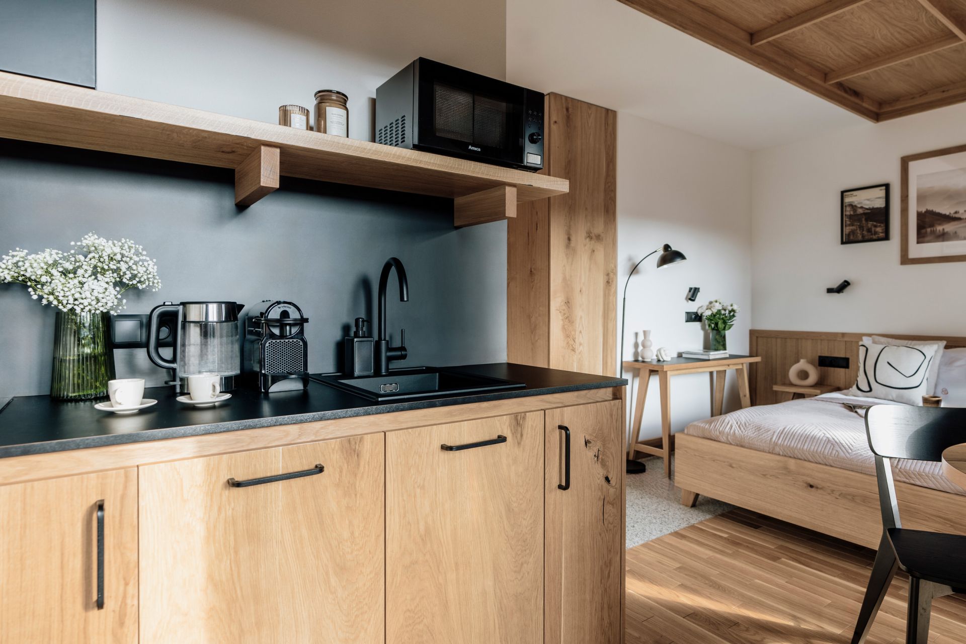 To komfortowy apartament typu Studio Deluxe, idealny dla pary lub dwóch osób dorosłych, ceniących wygodę i nowoczesne wnętrza. Przestrzeń o powierzchni 23 m² obejmuje strefę sypialnianą z dużym łóżkiem podwójnym, w pełni wyposażony aneks kuchenny z częścią jadalną oraz prywatną łazienkę z prysznicem lub wanną. Dodatkowym atutem jest taras/balkon, który sprzyja relaksowi po aktywnym dniu w górach. Apartament został zaprojektowany z myślą o funkcjonalnym i komfortowym pobycie w górach.