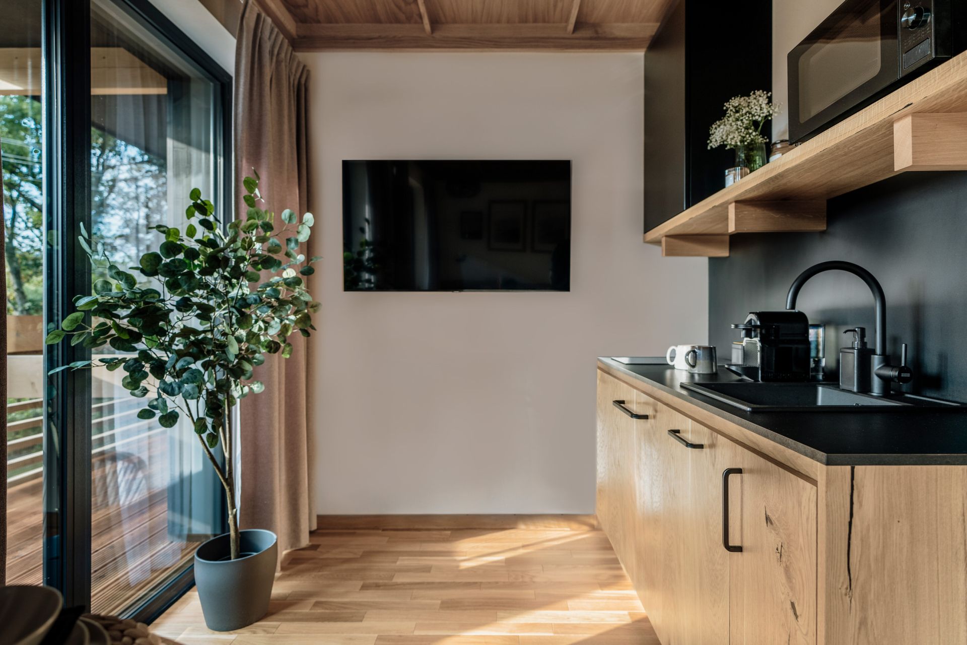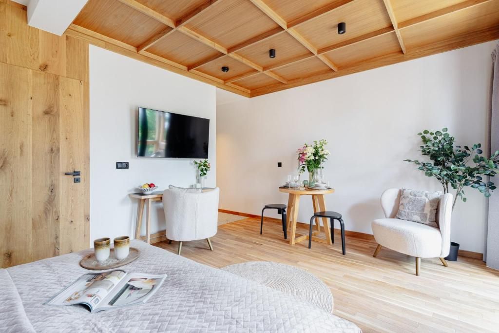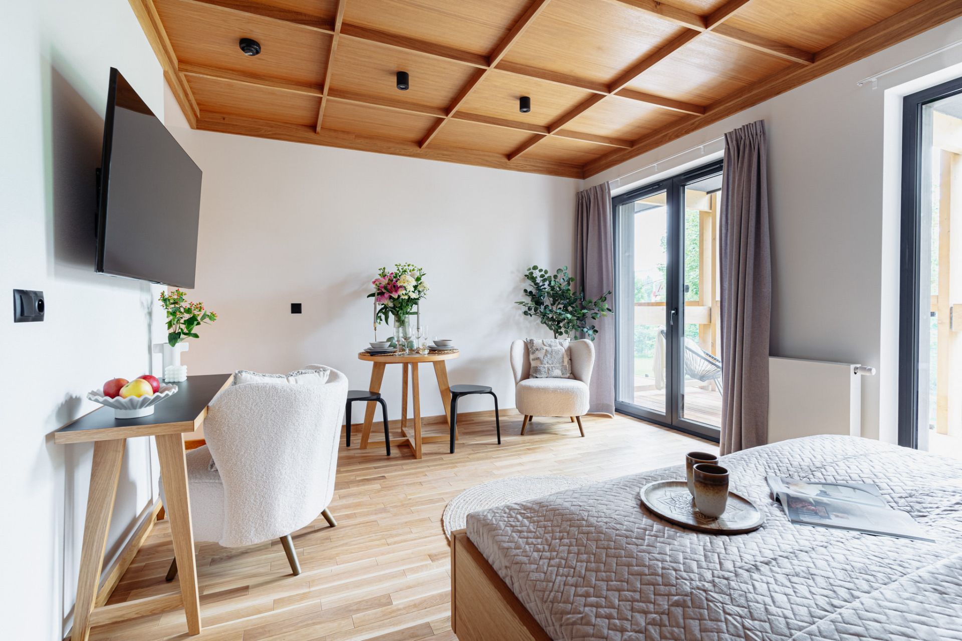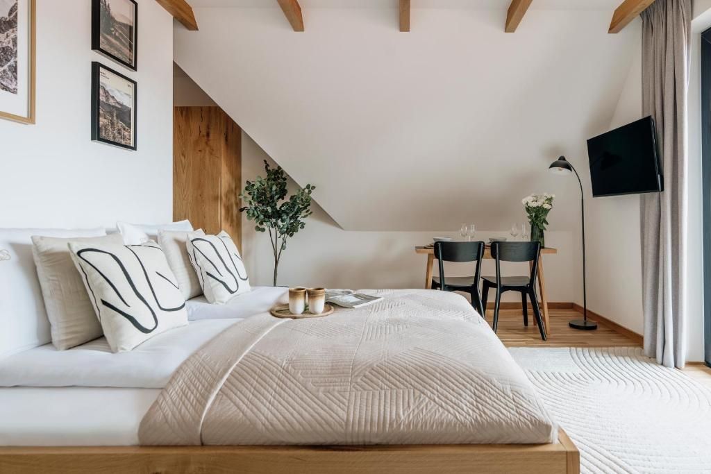 To komfortowy apartament typu Studio Deluxe, idealny dla pary lub dwóch osób dorosłych, ceniących wygodę i nowoczesne wnętrza. Przestrzeń o powierzchni 23 m² obejmuje strefę sypialnianą z dużym łóżkiem podwójnym, w pełni wyposażony aneks kuchenny z częścią jadalną oraz prywatną łazienkę z prysznicem lub wanną. Dodatkowym atutem jest taras/balkon, który sprzyja relaksowi po aktywnym dniu w górach. Apartament został zaprojektowany z myślą o funkcjonalnym i komfortowym pobycie w górach.