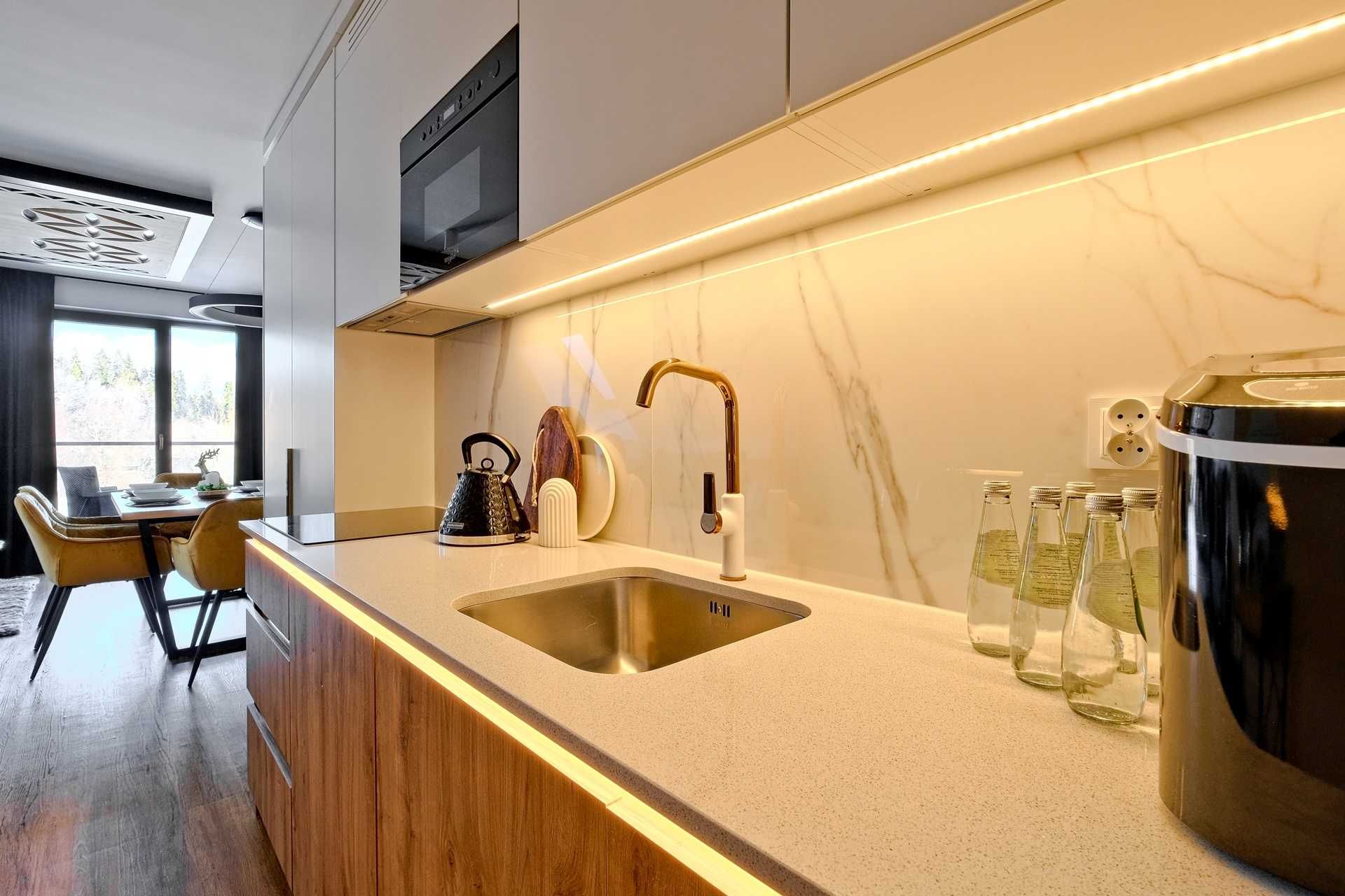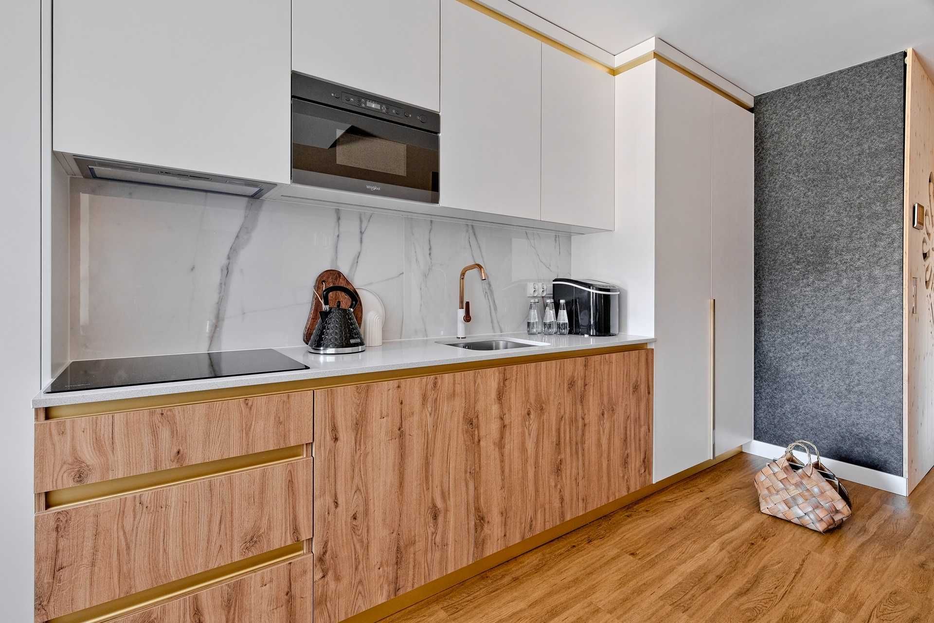 Aneks kuchenny: nowoczesna zabudowa kuchenna z lodówką, płytą indukcyjną, zmywarką, mikrofalówką, zlewozmywakiem i okapem. Wyposażony jest w czajnik, kostkarkę do lodu, garnki i patelnie, zastawę stołową dla 6 osób.
