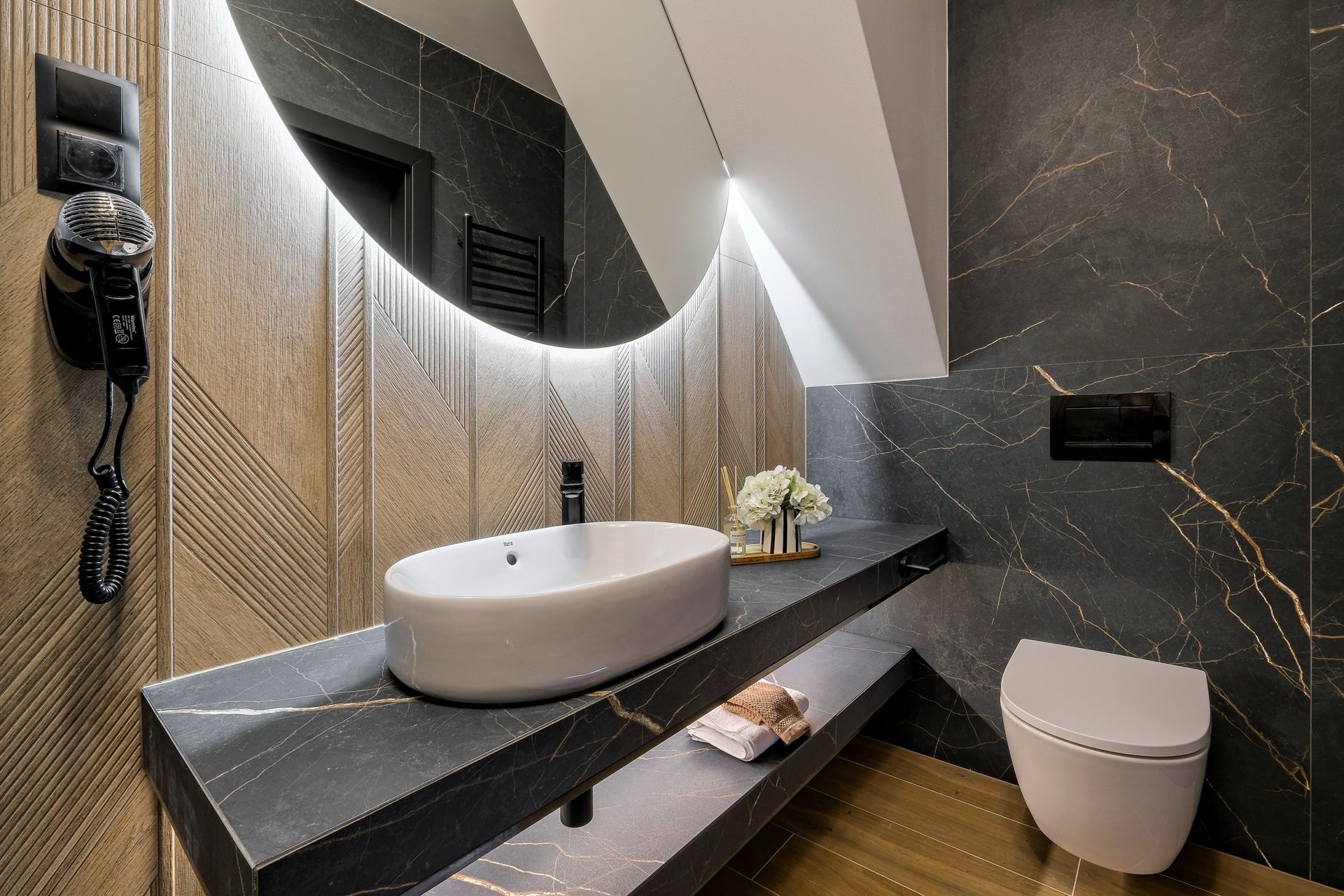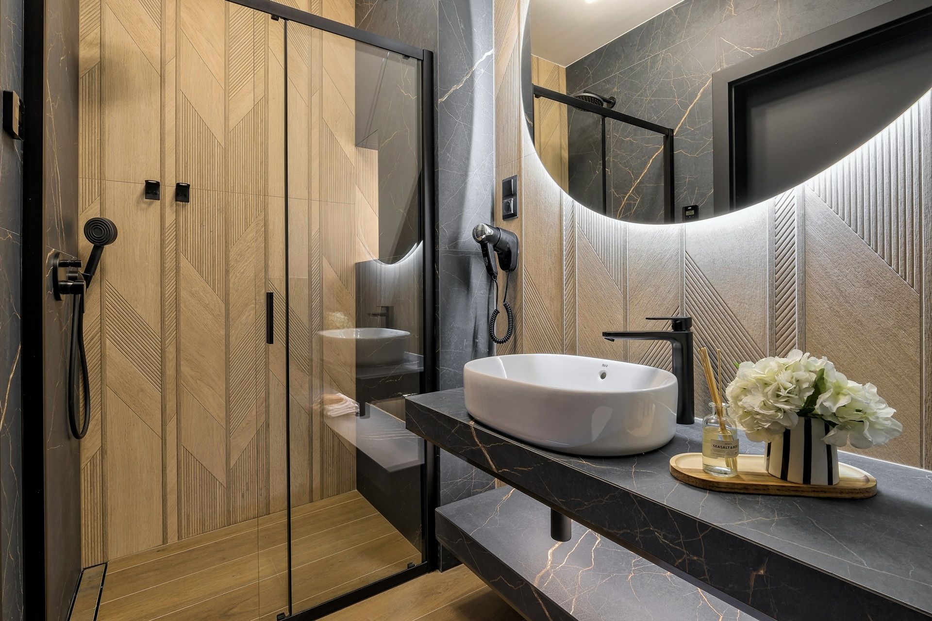 • Łazienka: eleganckie wnętrze z czarnym kamieniem, prysznic, WC i umywalka