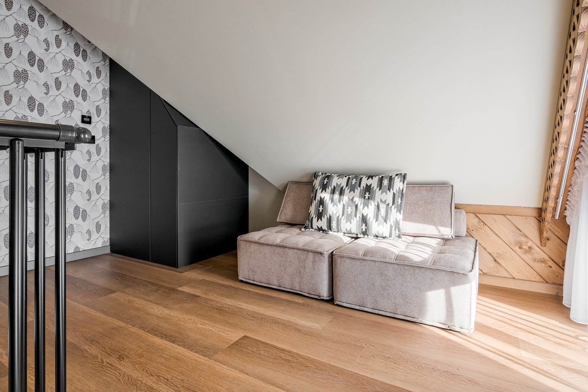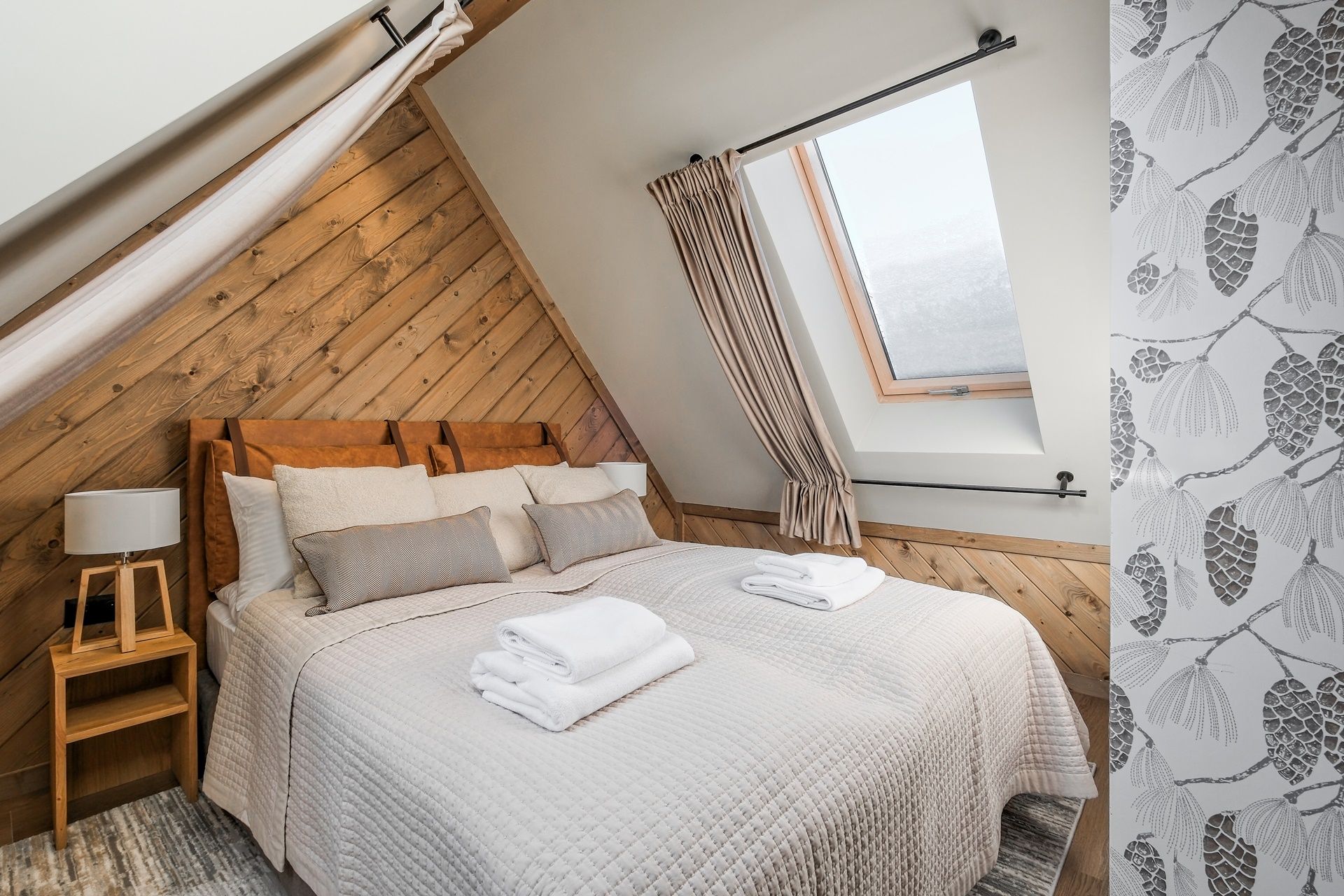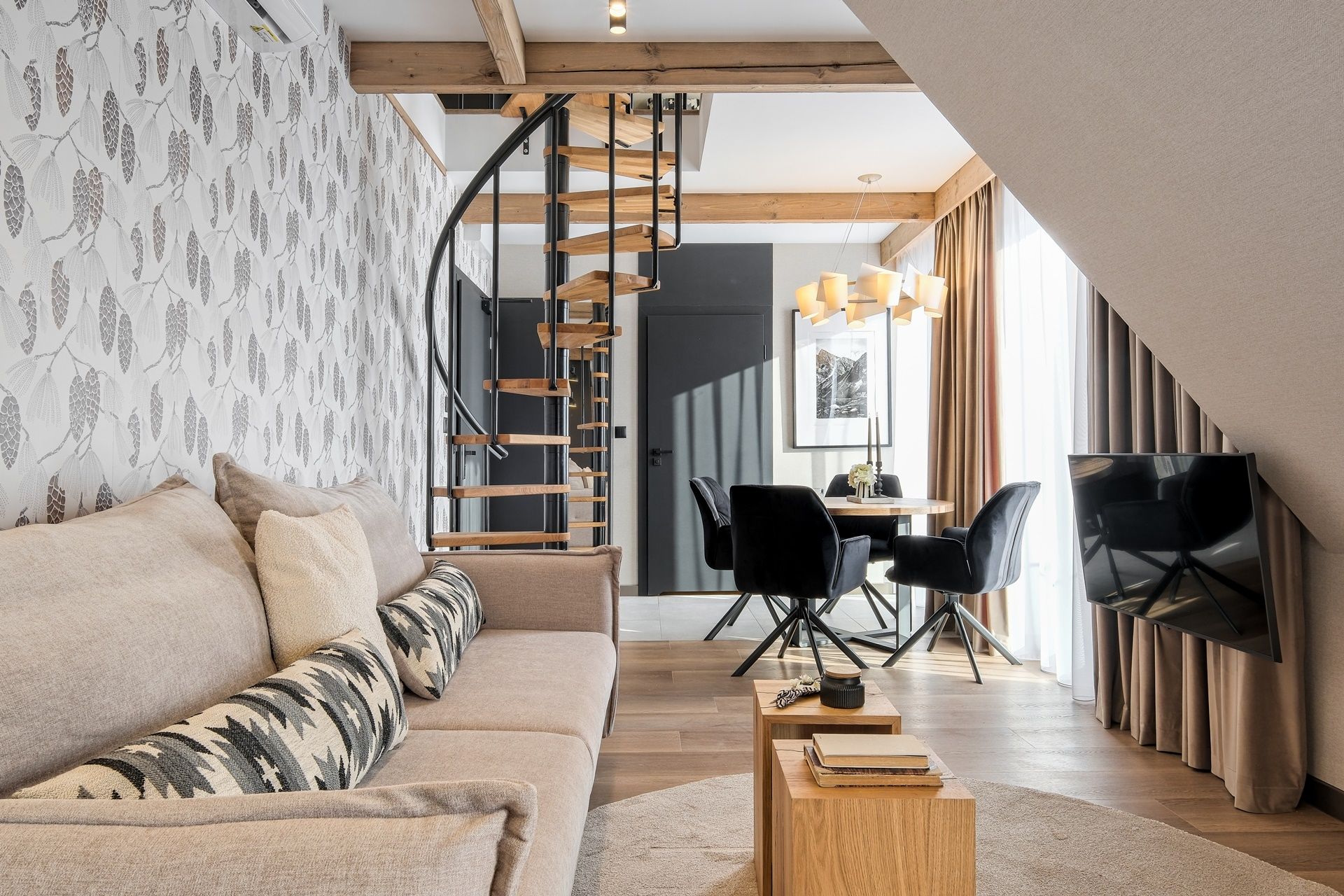 Apartament zachwyca dopracowanymi detalami oraz stonowaną, naturalną kolorystyką. Drewniane akcenty, miękkie tkaniny i designerskie oświetlenie tworzą przytulny, górski klimat.