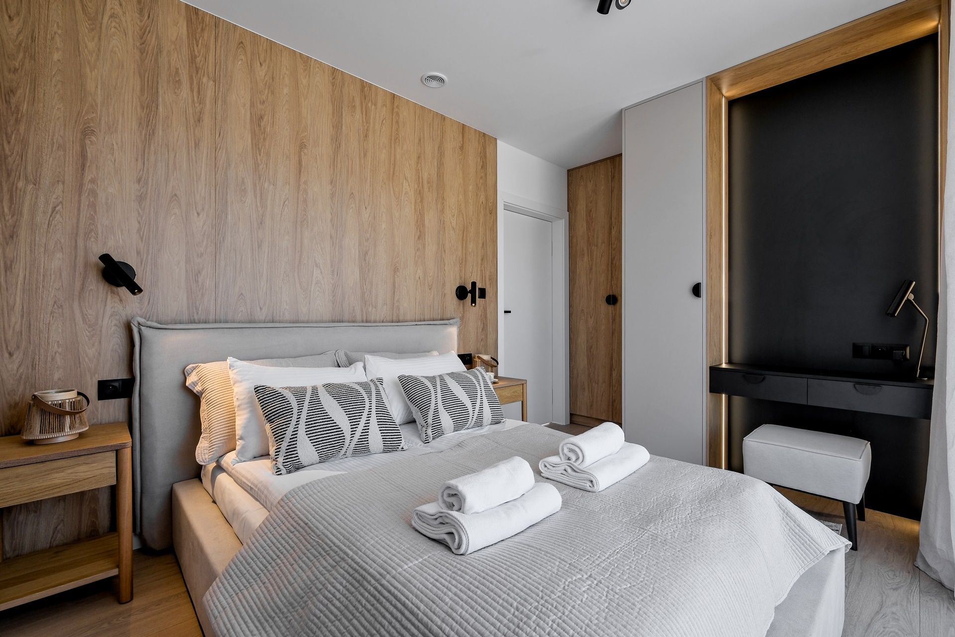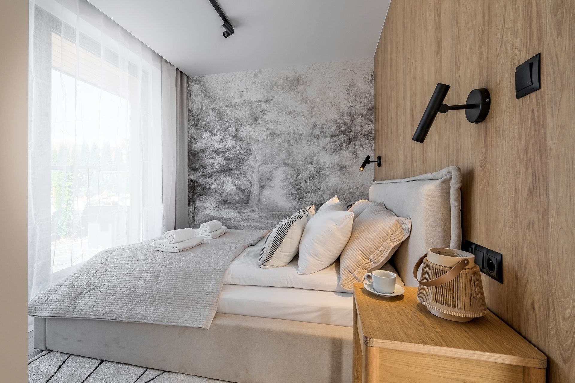 Sypialnia 1: łóżko małżeńskie ( 160x200 ), stolik nocny, szafa, biurko, przytulne oświetlenie, wyjście na taras.