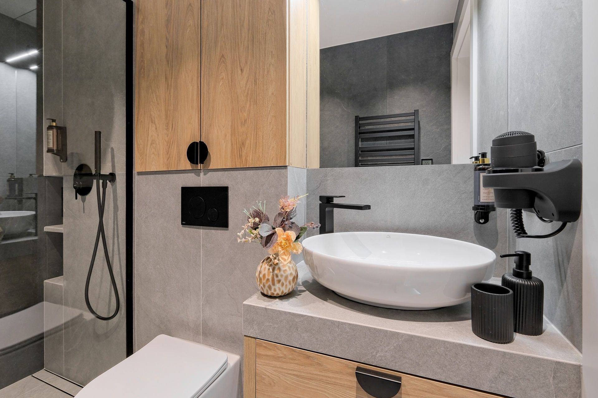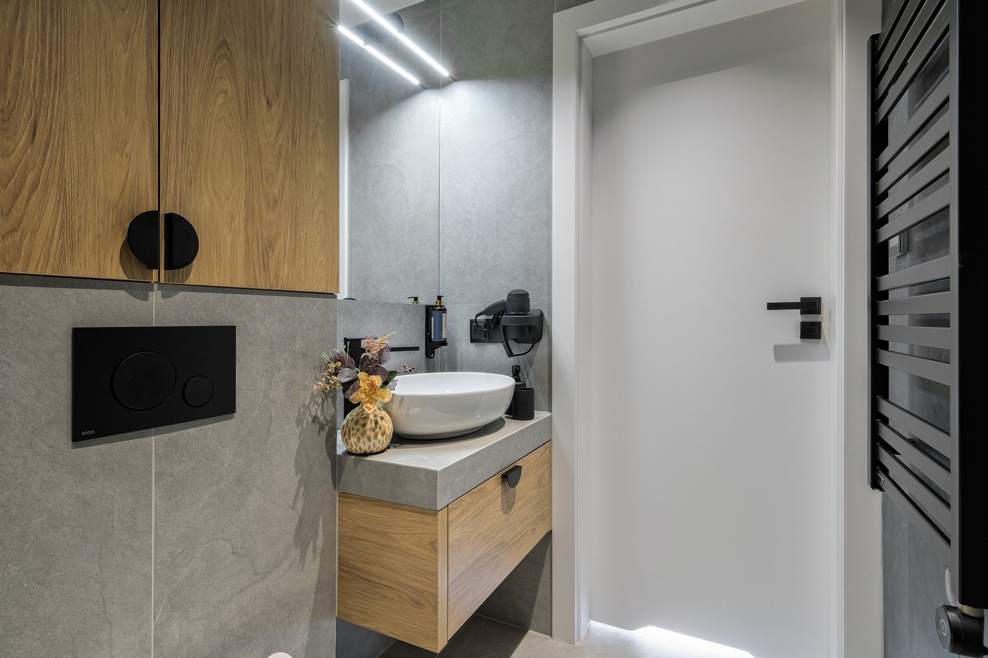 Łazienka: prysznic, toaleta, umywalka, szafka, lustro, grzejnik łazienkowy, suszarka, ręczniki, zestaw kosmetyków.
