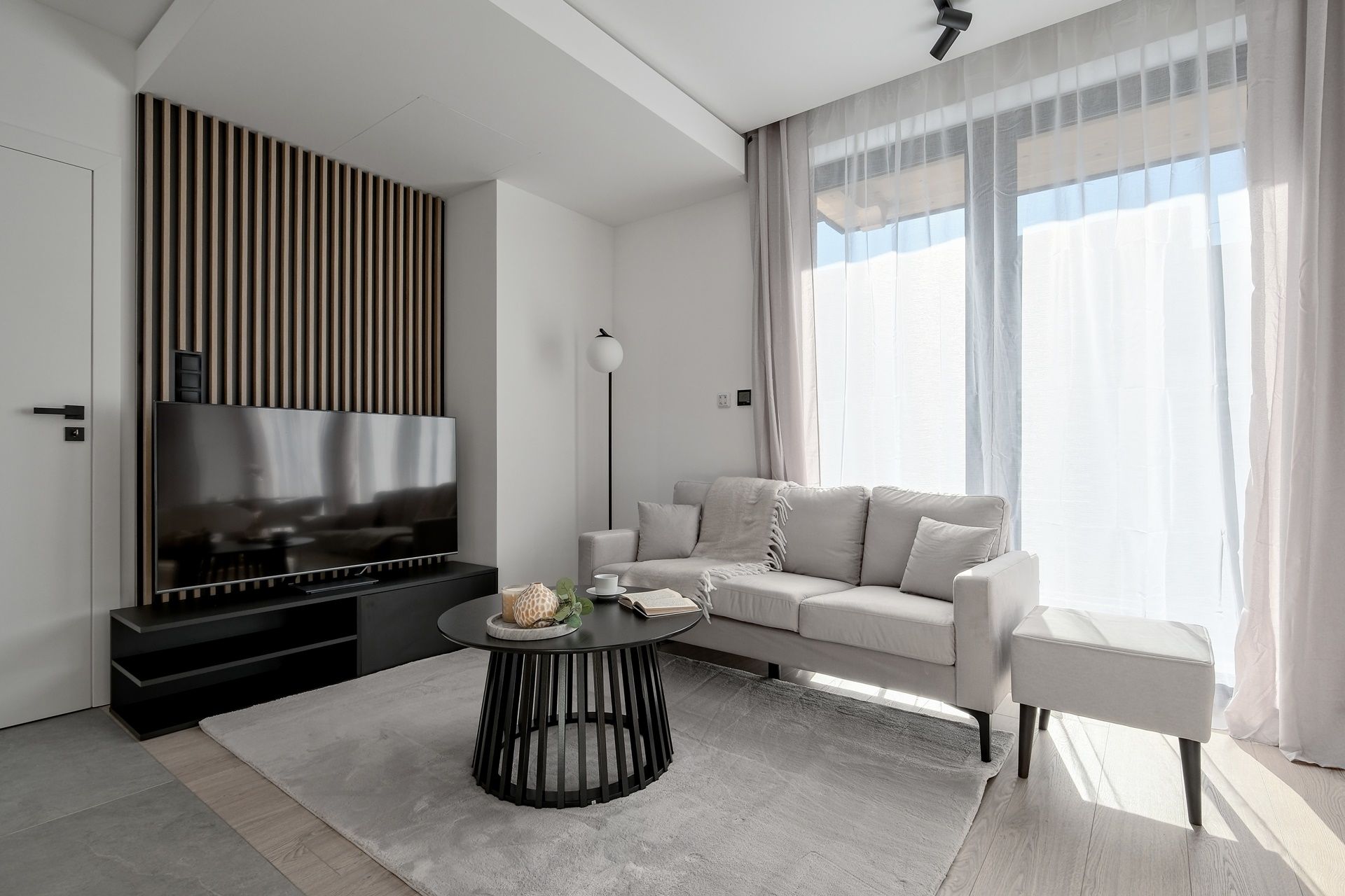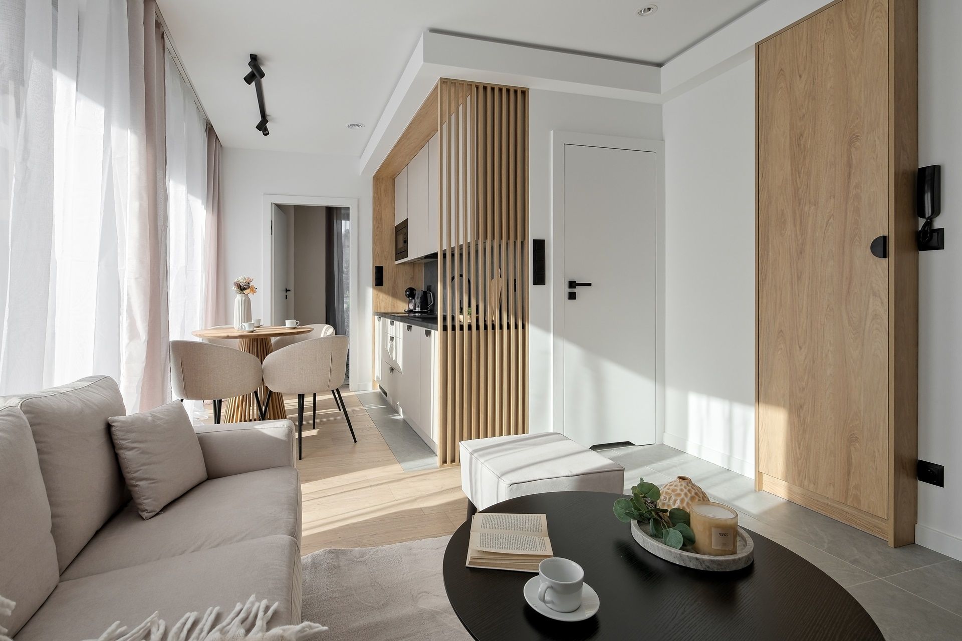 Salon: drewniany stół oraz 4 krzesła, TV, kanapa, stolik kawowy, wyjście na taras.