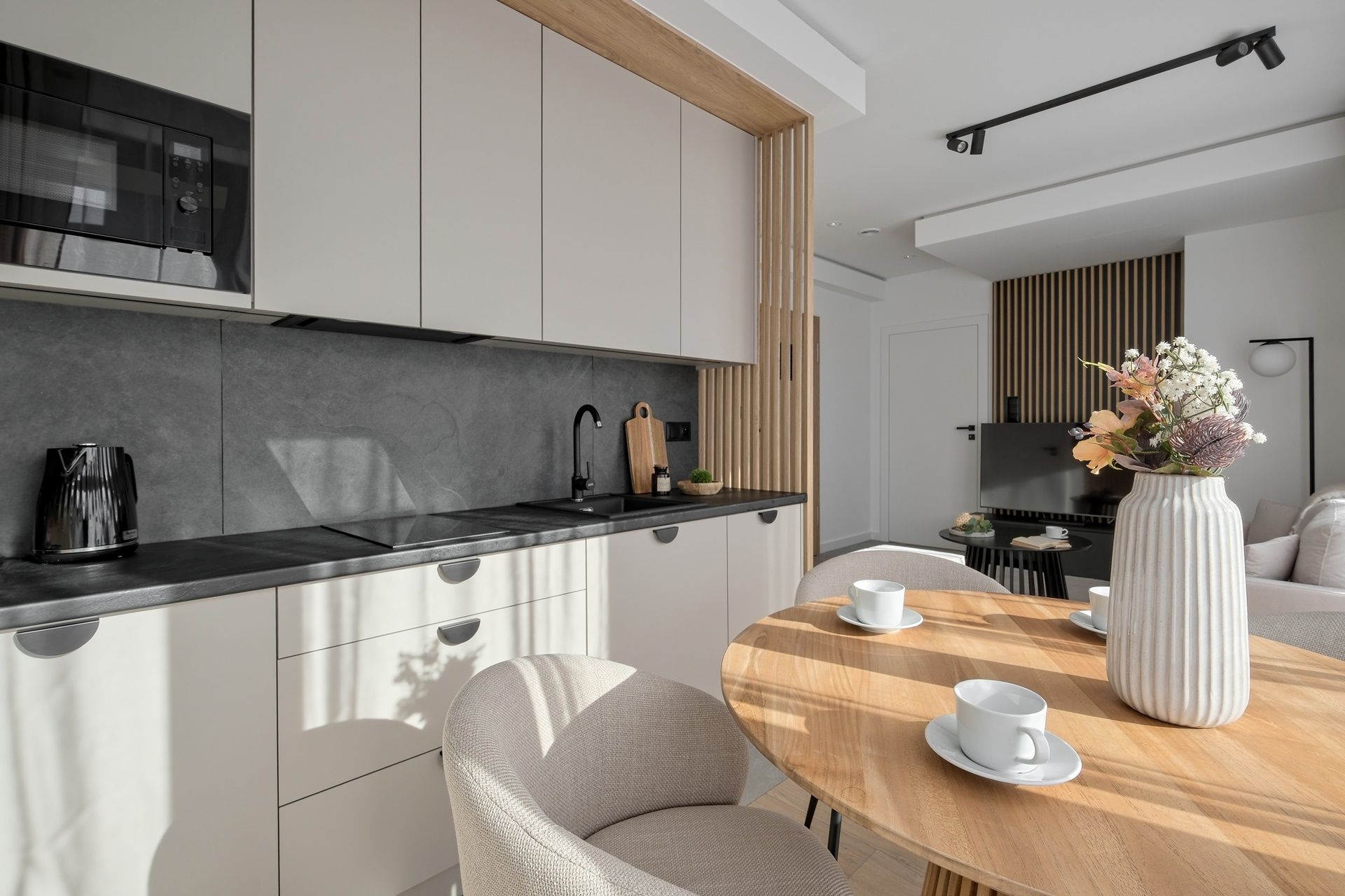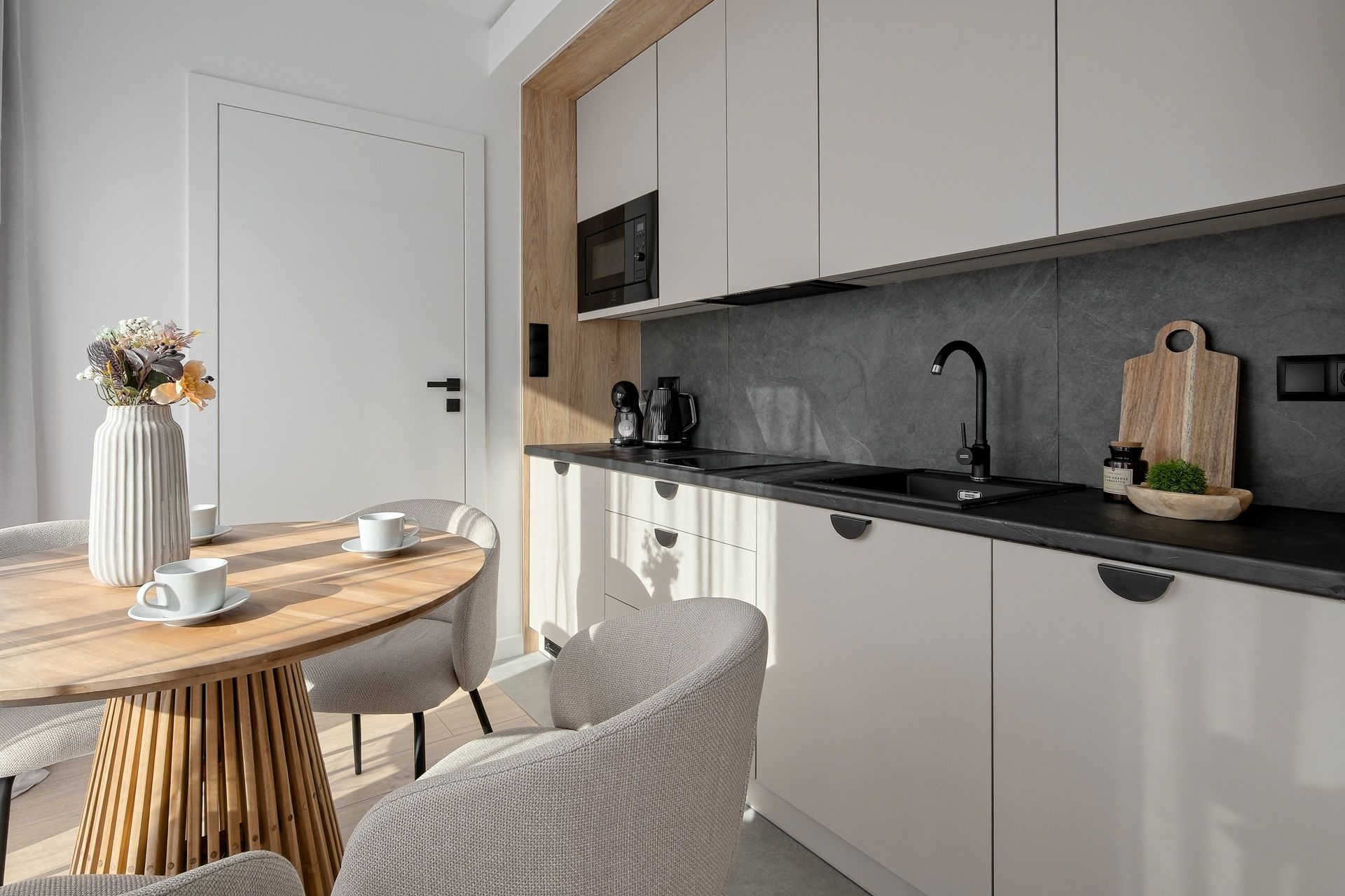 Aneks kuchenny: nowoczesna zabudowa kuchenna z lodówką, płytą indukcyjną, zmywarką, zlewozmywakiem. Wyposażony w czajnik, toster, ekspres do kawy, mikrofalę, garnki, patelnie i zastawę stołową dla 4 osób.