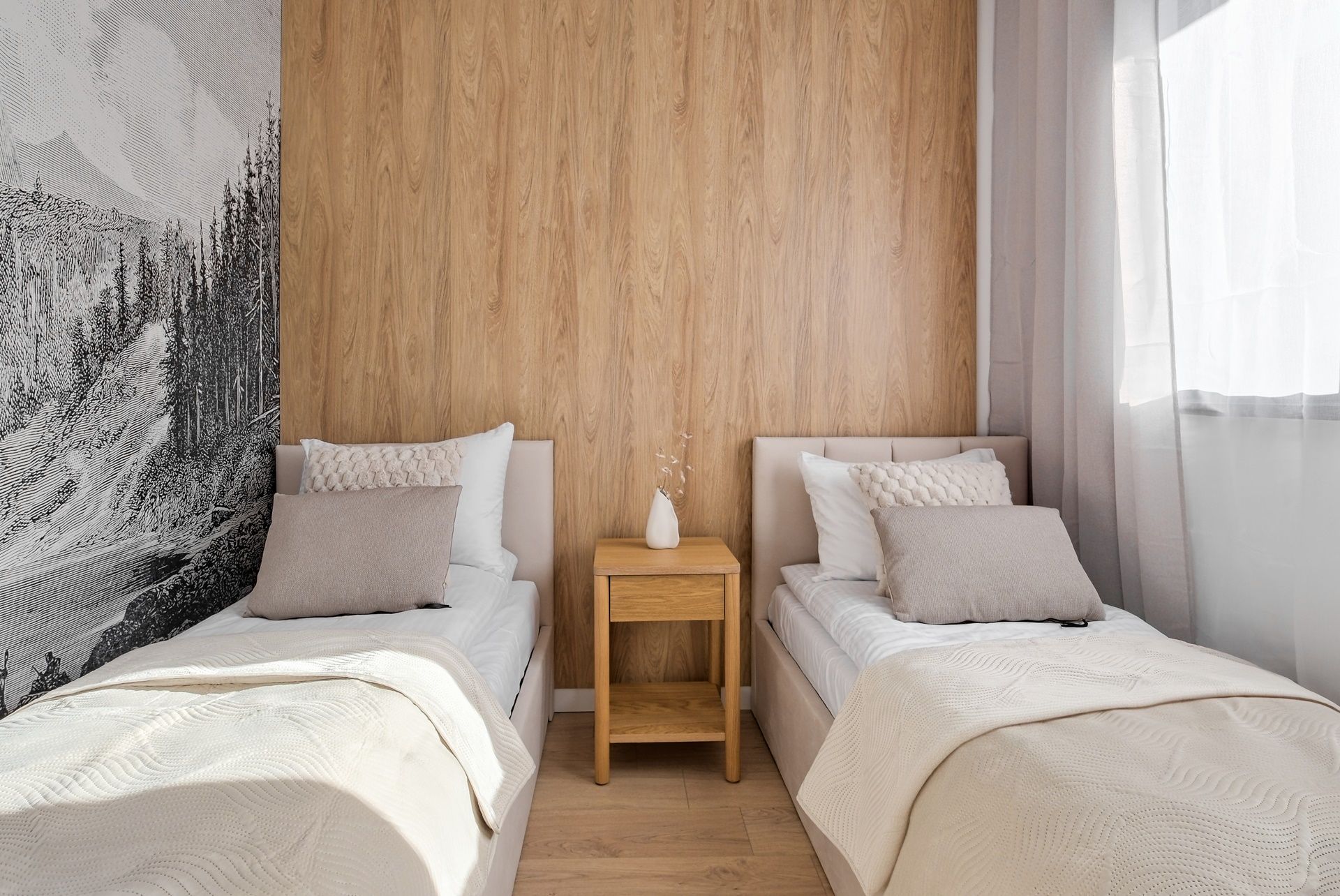 Sypialnia 2: 2 pojedyncze łóżka ( 80x200 ), stolik nocny, szafa, przytulne oświetlenie.