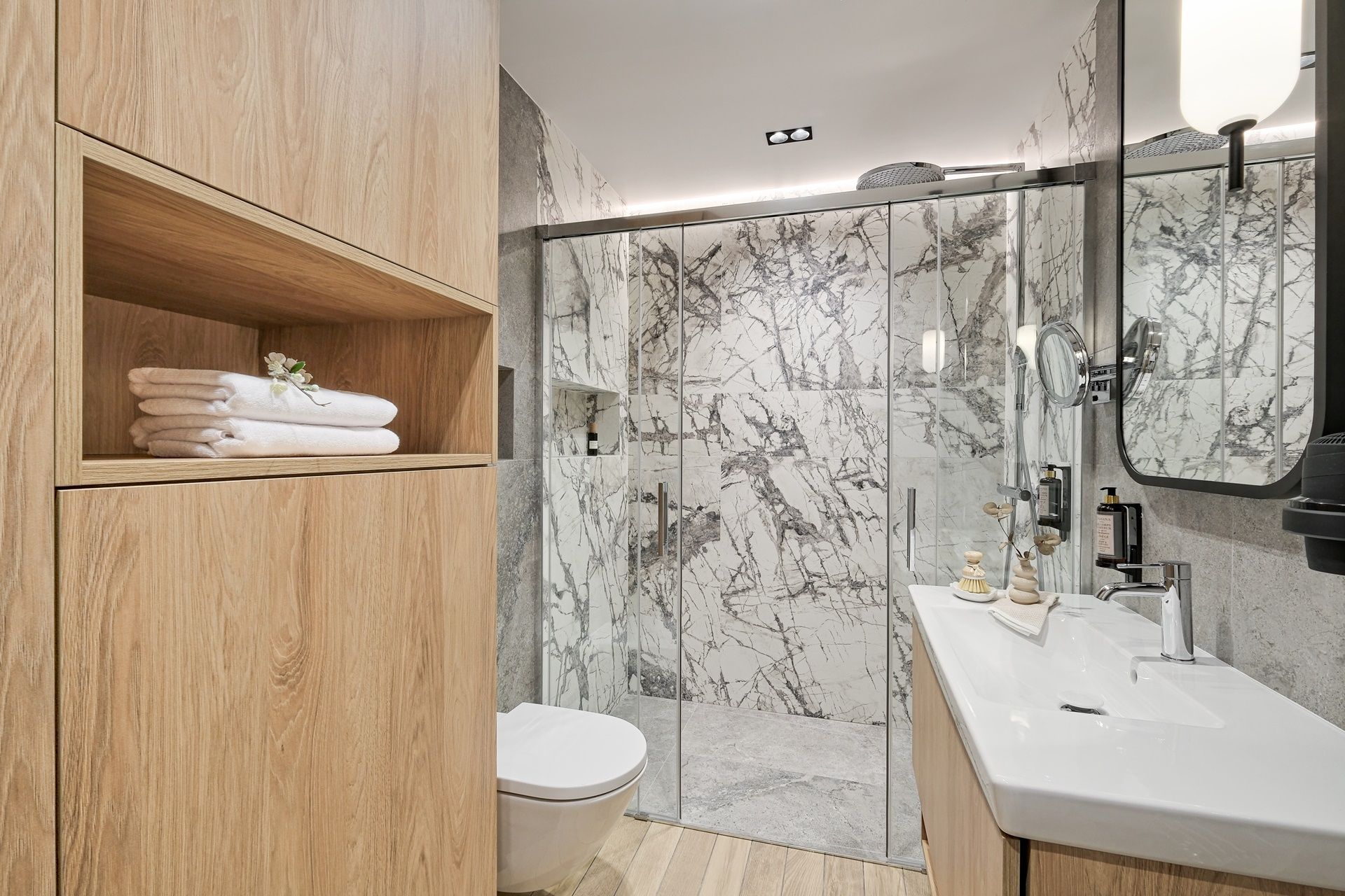 Łazienka: prysznic, toaleta, umywalka, grzejnik łazienkowy, suszarka, ręczniki, lustro, pralka.