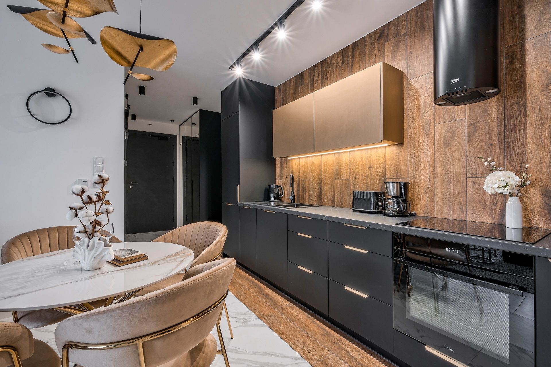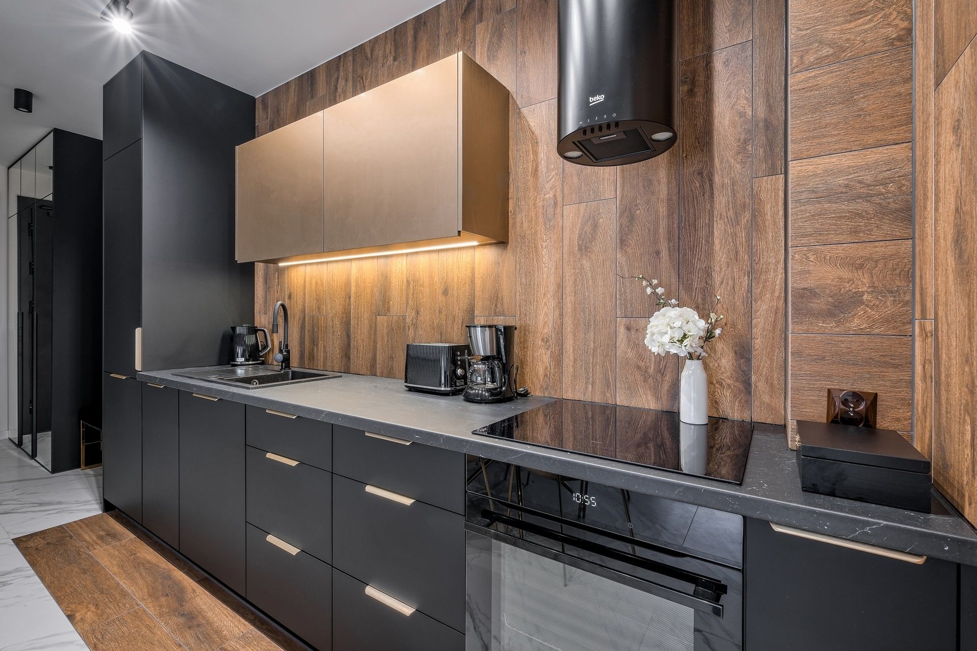 Aneks kuchenny: nowoczesna kuchnia z lodówką, płytą indukcyjną, zmywarką, piekarnikiem, zlewozmywakiem i okapem. Aneks wyposażony jest w czajnik, ekspres, toster, garnki, patelnie, zastawę stołową i kieliszki.