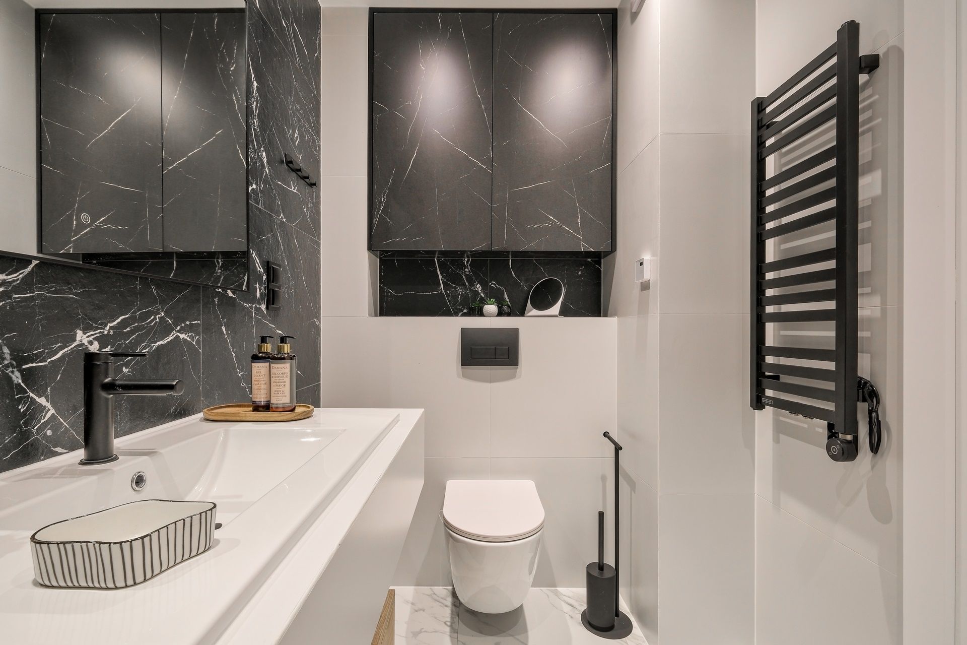 Łazienka: prysznic, toaleta, umywalka, grzejnik łazienkowy, suszarka, ręczniki, lustro, kosmetyki.