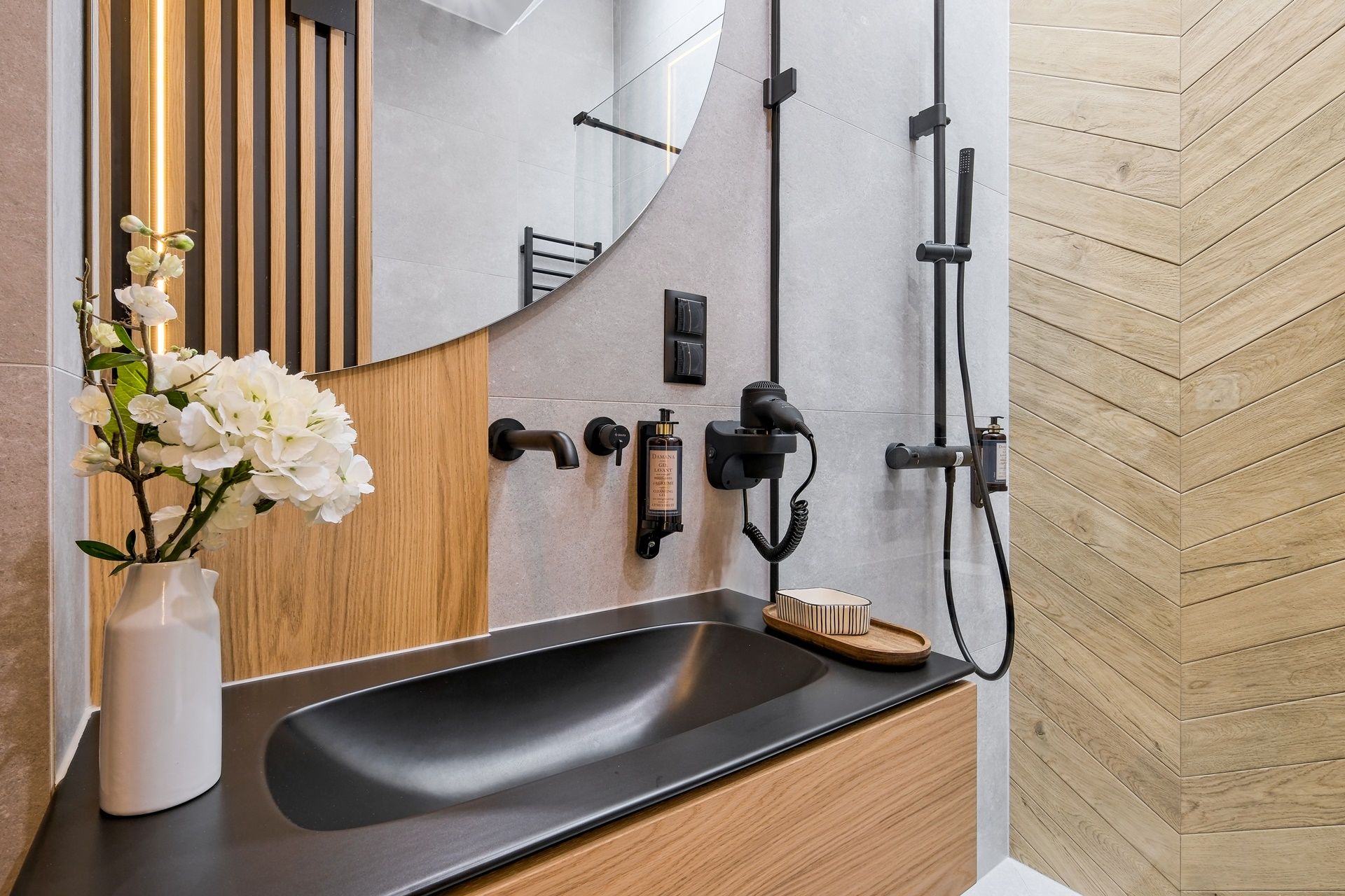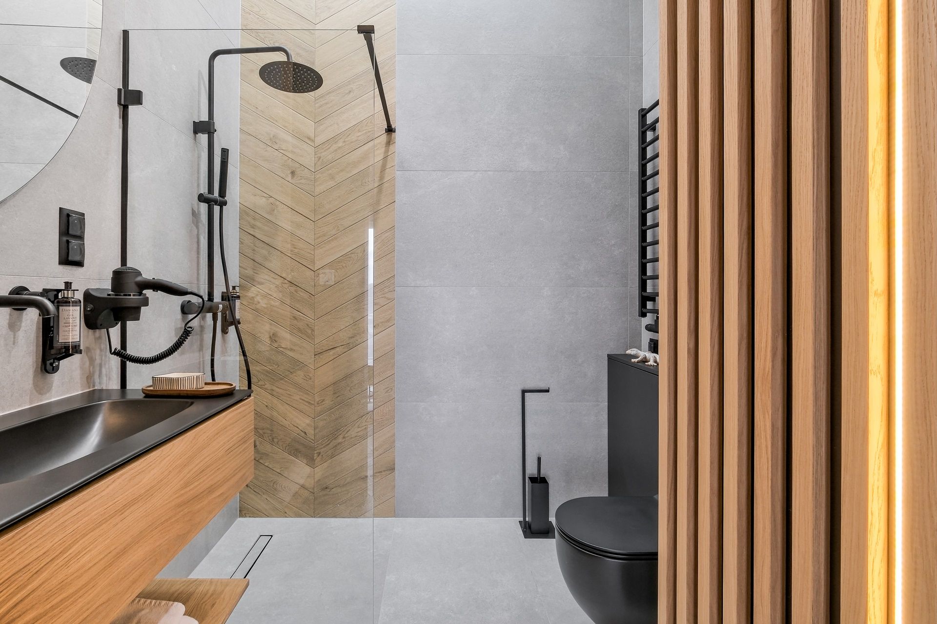 Łazienka: prysznic, toaleta, umywalka, grzejnik łazienkowy, suszarka, ręczniki, lustro, kosmetyki, pralka.
