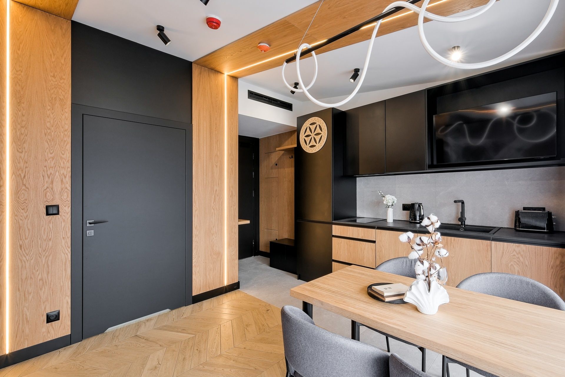 Aneks kuchenny: nowoczesna kuchnia z lodówką, płytą indukcyjną, zmywarką, zlewozmywakiem i okapem. Aneks wyposażony jest w czajnik, toster, ekspres, garnki, patelnie, zastawę stołową i kieliszki.