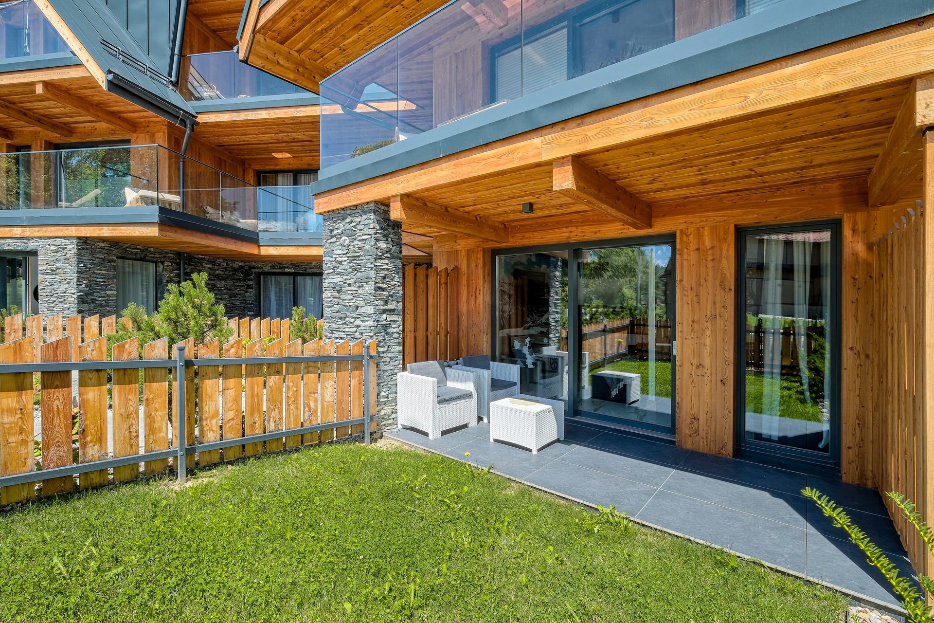 Nasz Apartament to oaza nowoczesności i komfortu, zapewniająca niezapomniane doświadczenia podczas pobytu w Białce Tatrzańskiej. Apartament składa się z przestronnego salonu, w którym znajduje się duży stół z krzesłami, TV, wygodna rozkładana sofa oraz stolik kawowy. Z salonu można wyjść bezpośrednio na taras, co zapewnia dodatkową przestrzeń do relaksu.