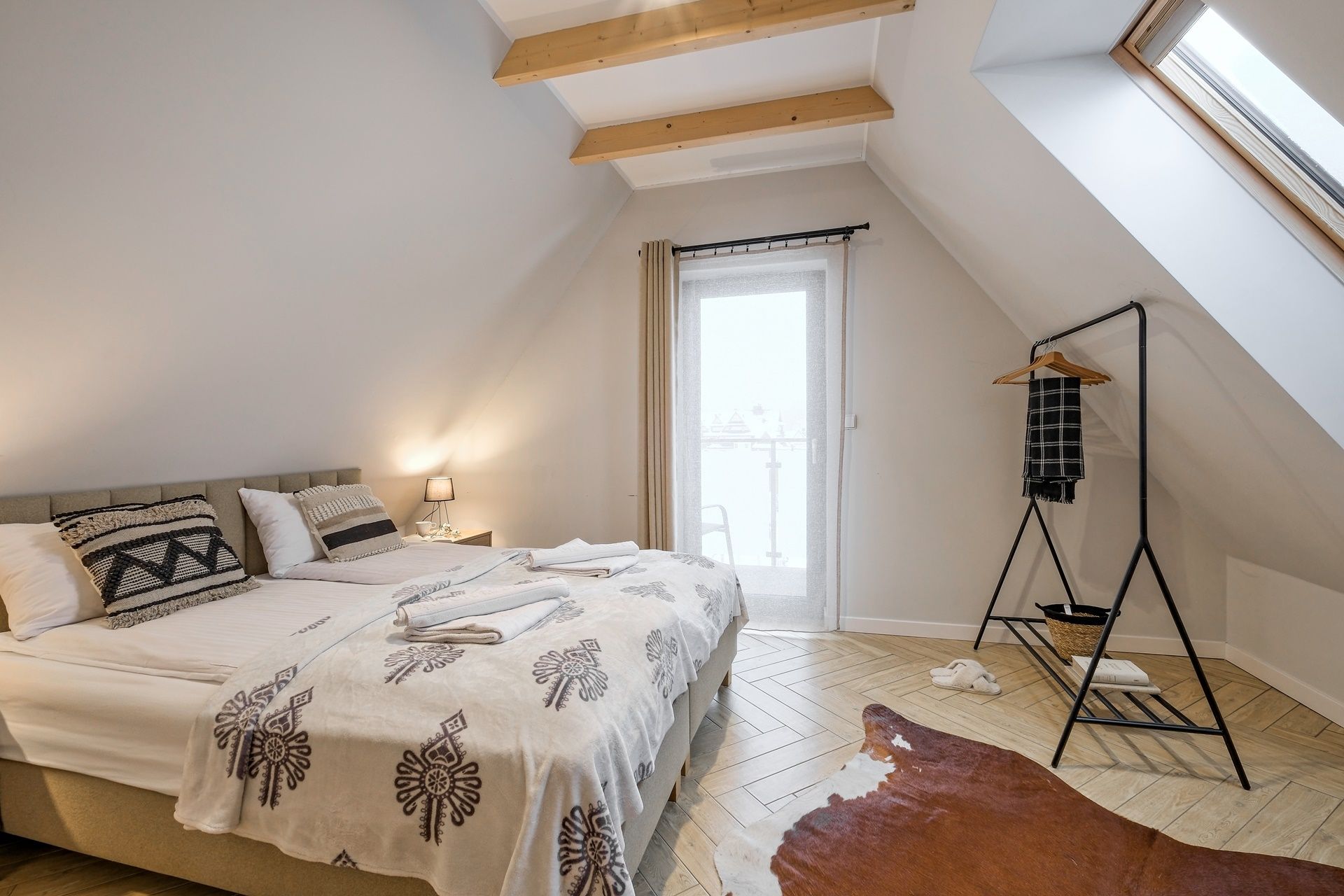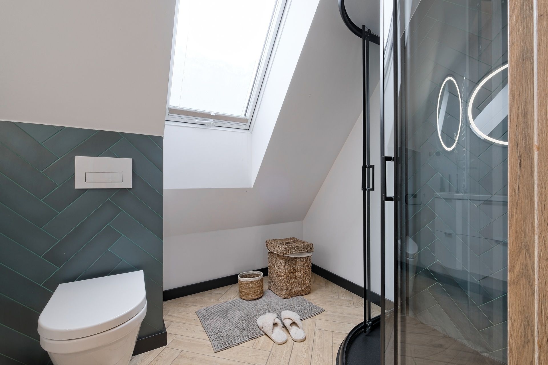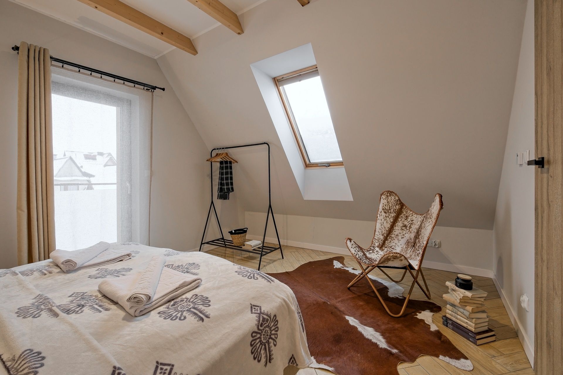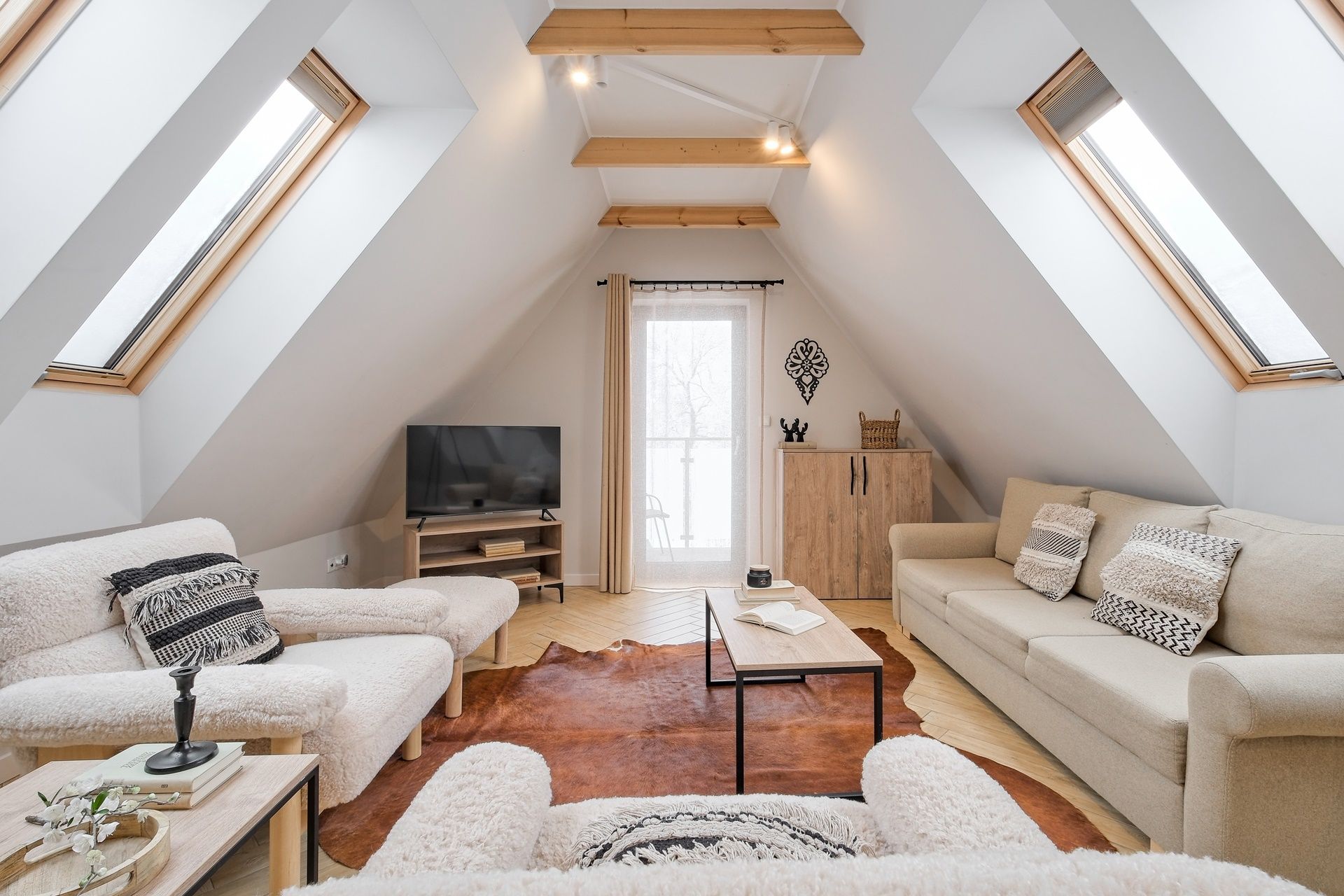 Aż 10 okien dachowych oraz dwa przeszklenia balkonowe zapewniają mnóstwo naturalnego światła i wyjątkową atmosferę – latem wypełnioną słońcem, a zimą przytulną i nastrojową.