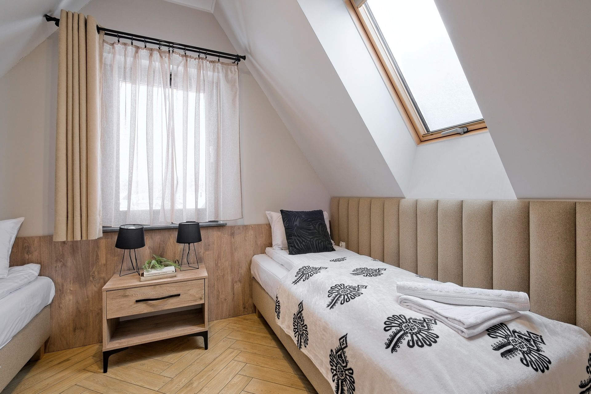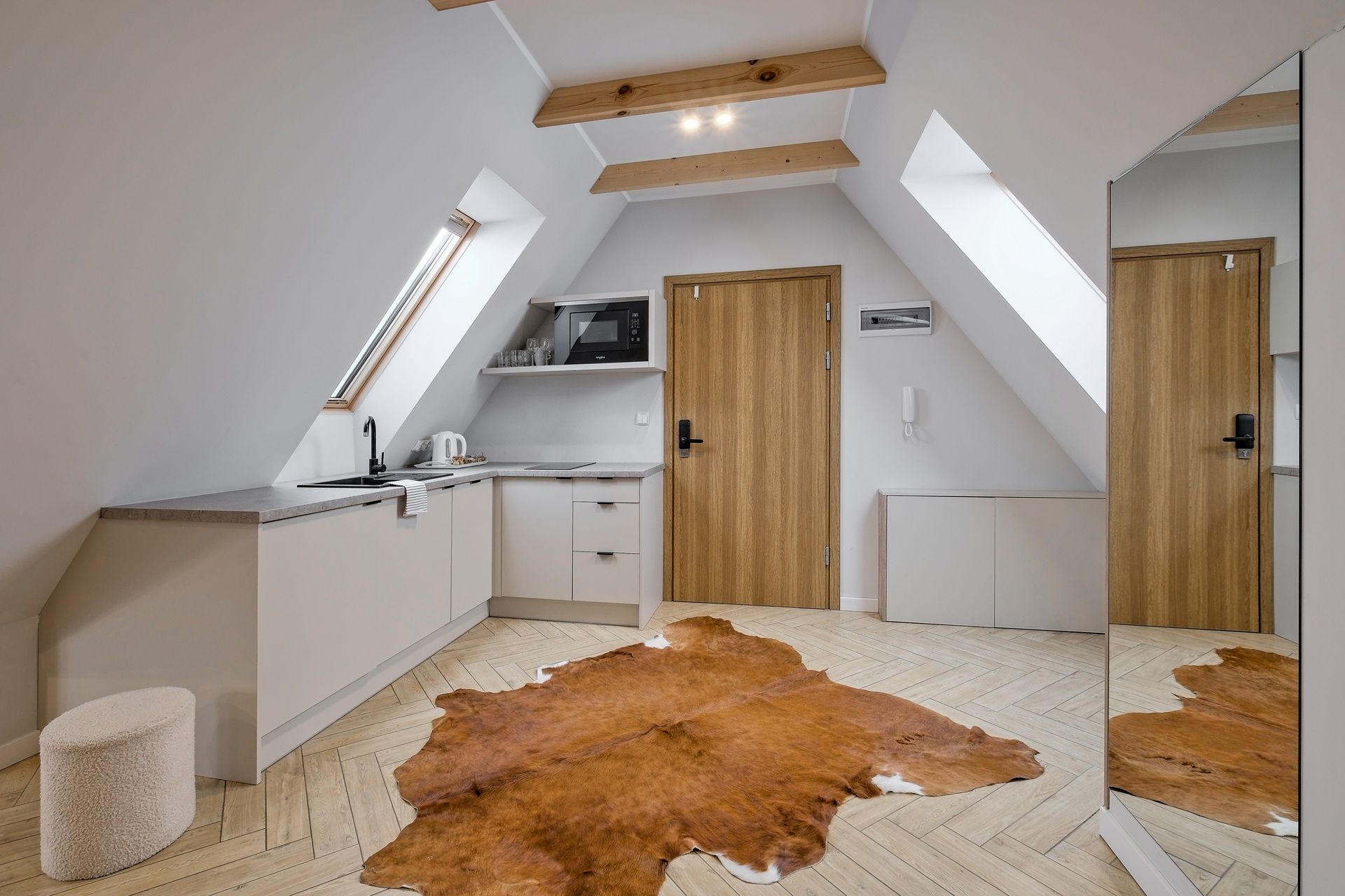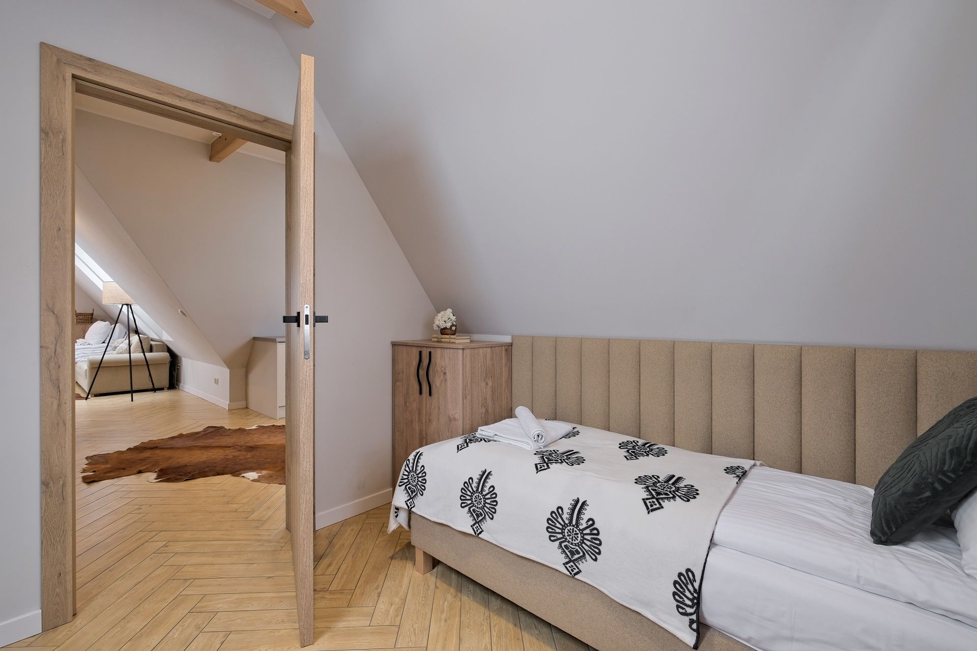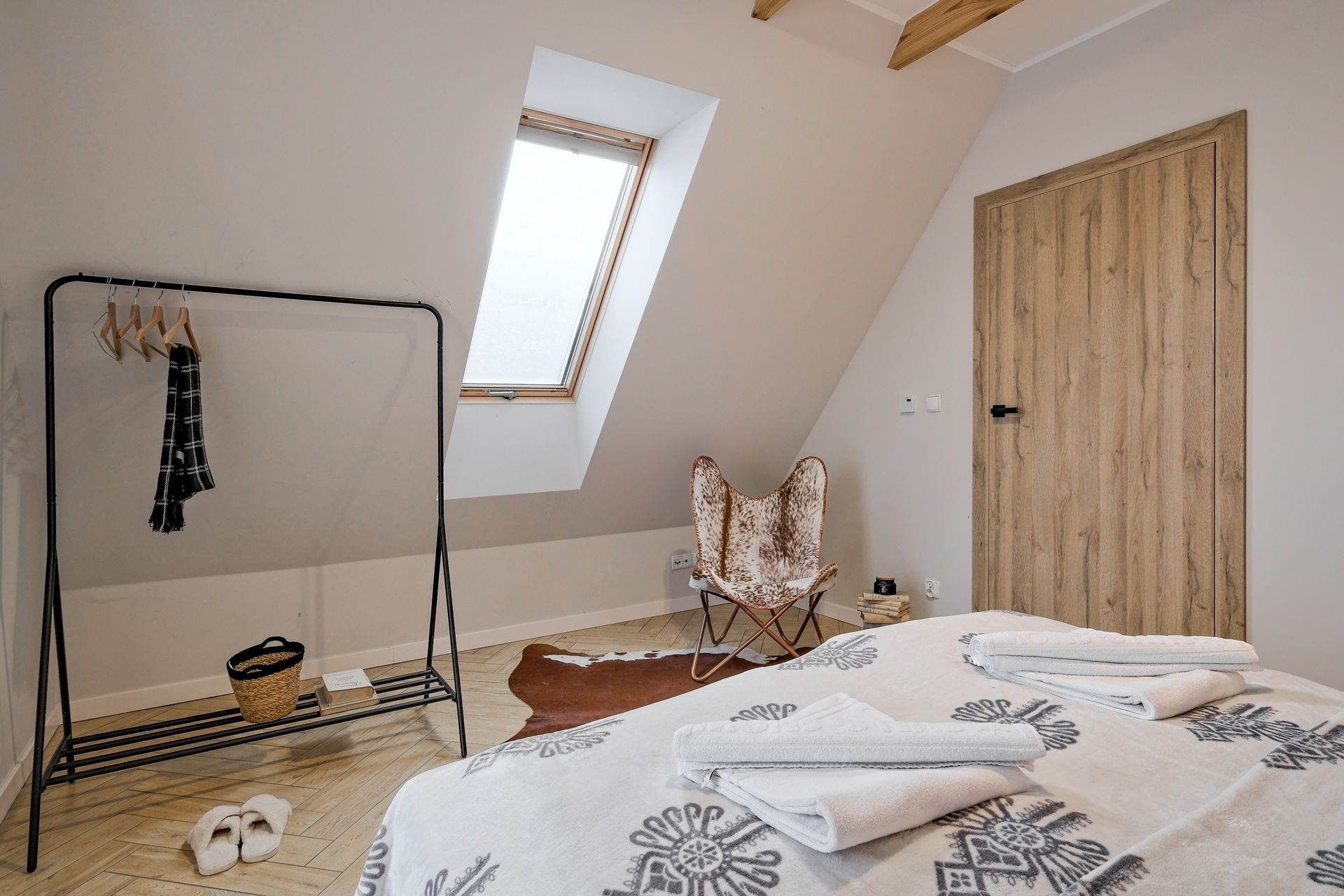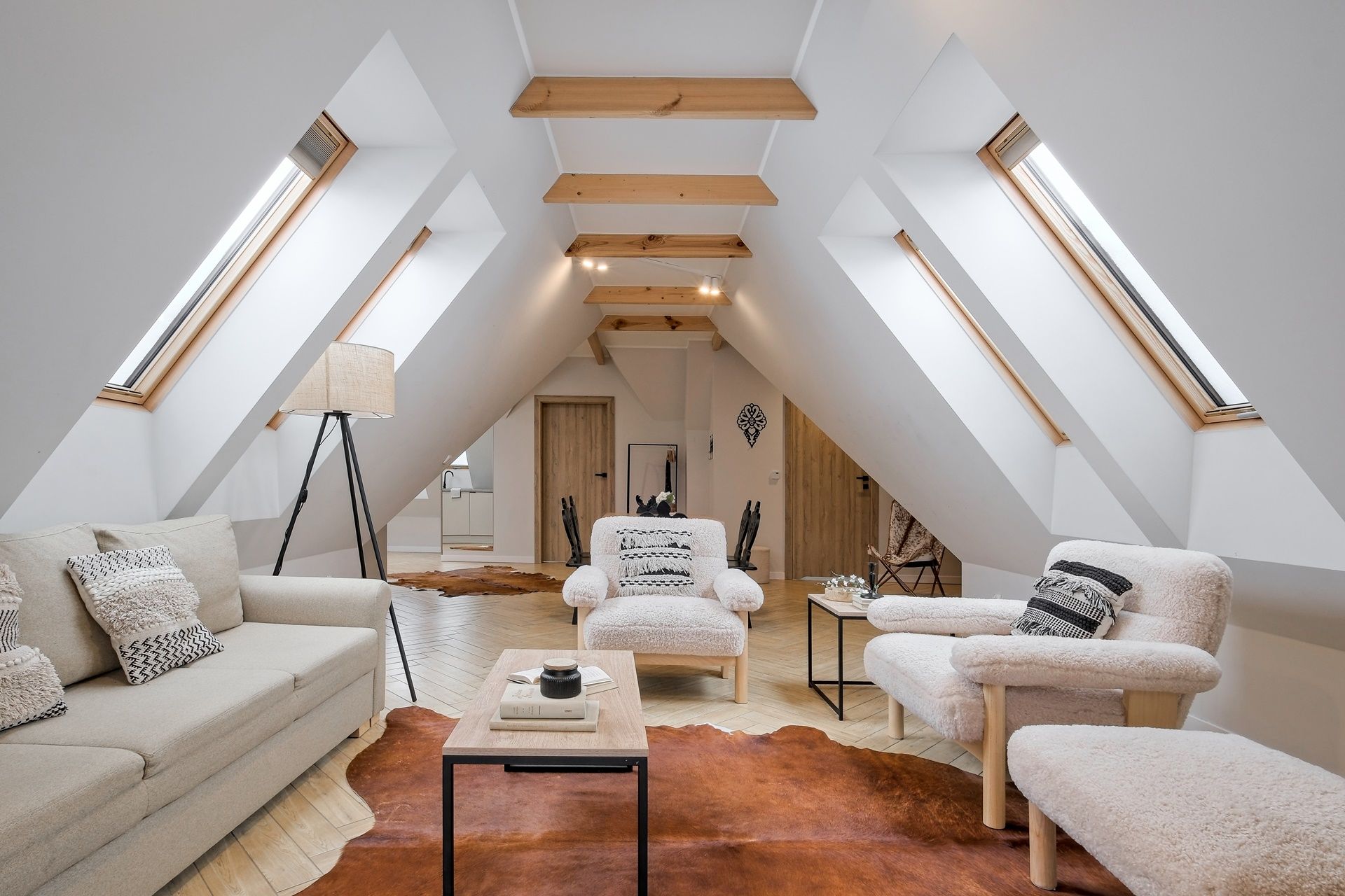 Aż 10 okien dachowych oraz dwa przeszklenia balkonowe zapewniają mnóstwo naturalnego światła i wyjątkową atmosferę – latem wypełnioną słońcem, a zimą przytulną i nastrojową.