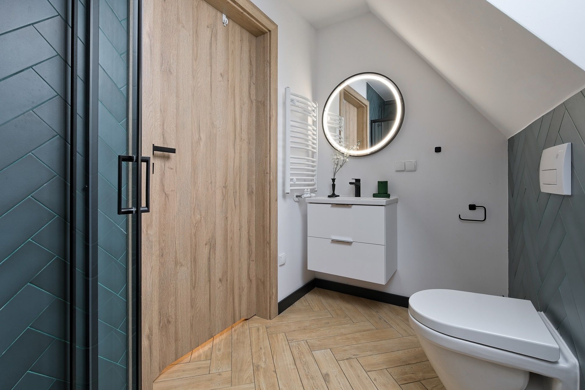 Połączenie drewna i matowych zielonych płytek tworzy estetyczną, relaksującą przestrzeń.