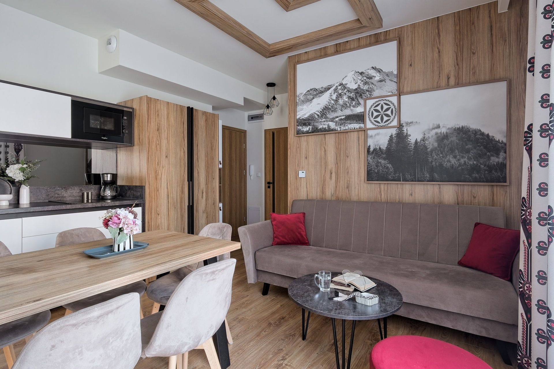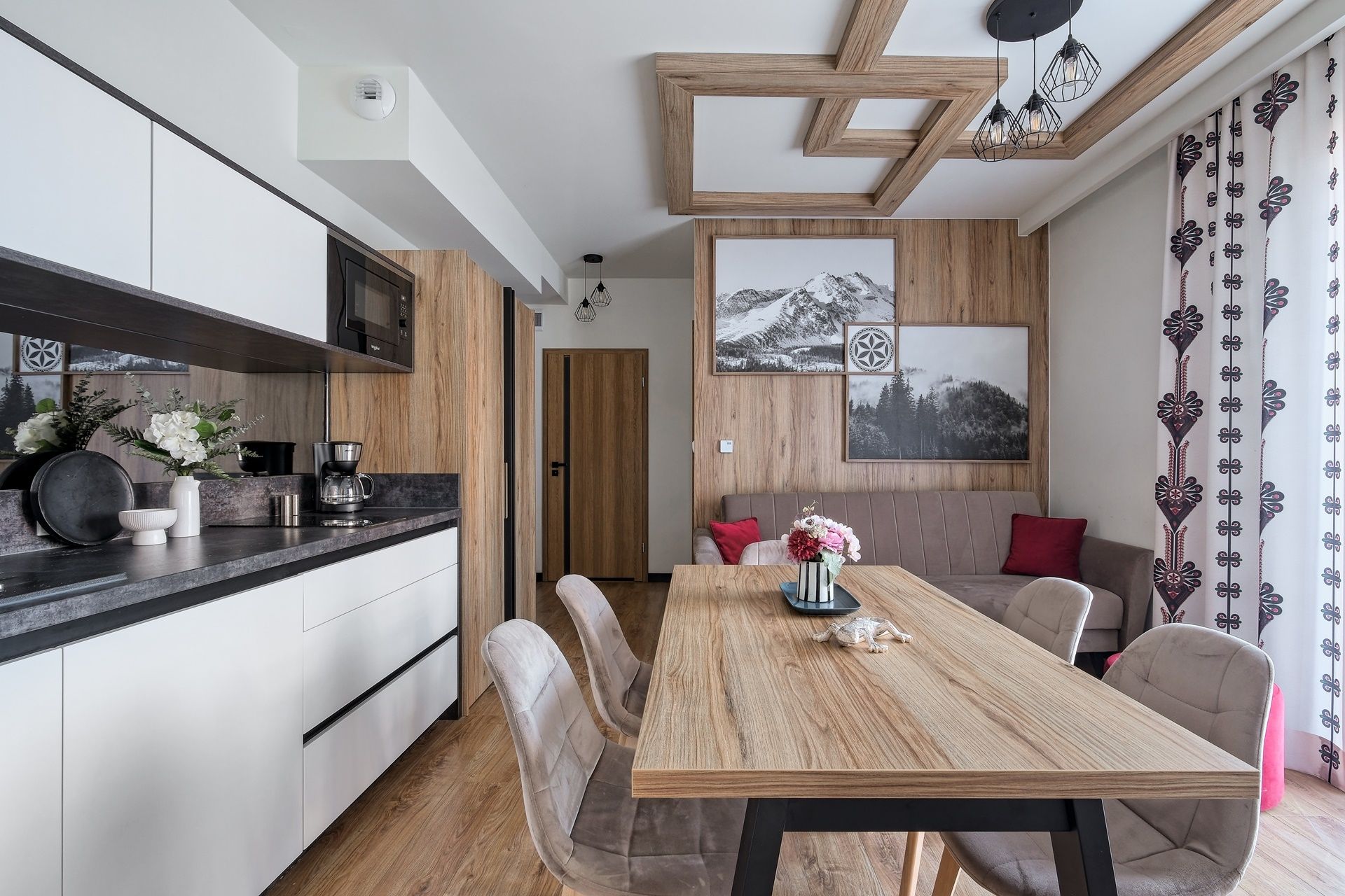 Apartament A1 to nowoczesna, jasna i funkcjonalna przestrzeń idealna dla rodzin, par oraz grupy przyjaciół. Stonowane, ciepłe barwy, drewno i górskie akcenty tworzą atmosferę relaksu już od pierwszego wejścia. Dzięki przemyślanemu układowi oraz bogatemu wyposażeniu apartament doskonale sprawdzi się zarówno na krótki wyjazd, jak i dłuższy pobyt.