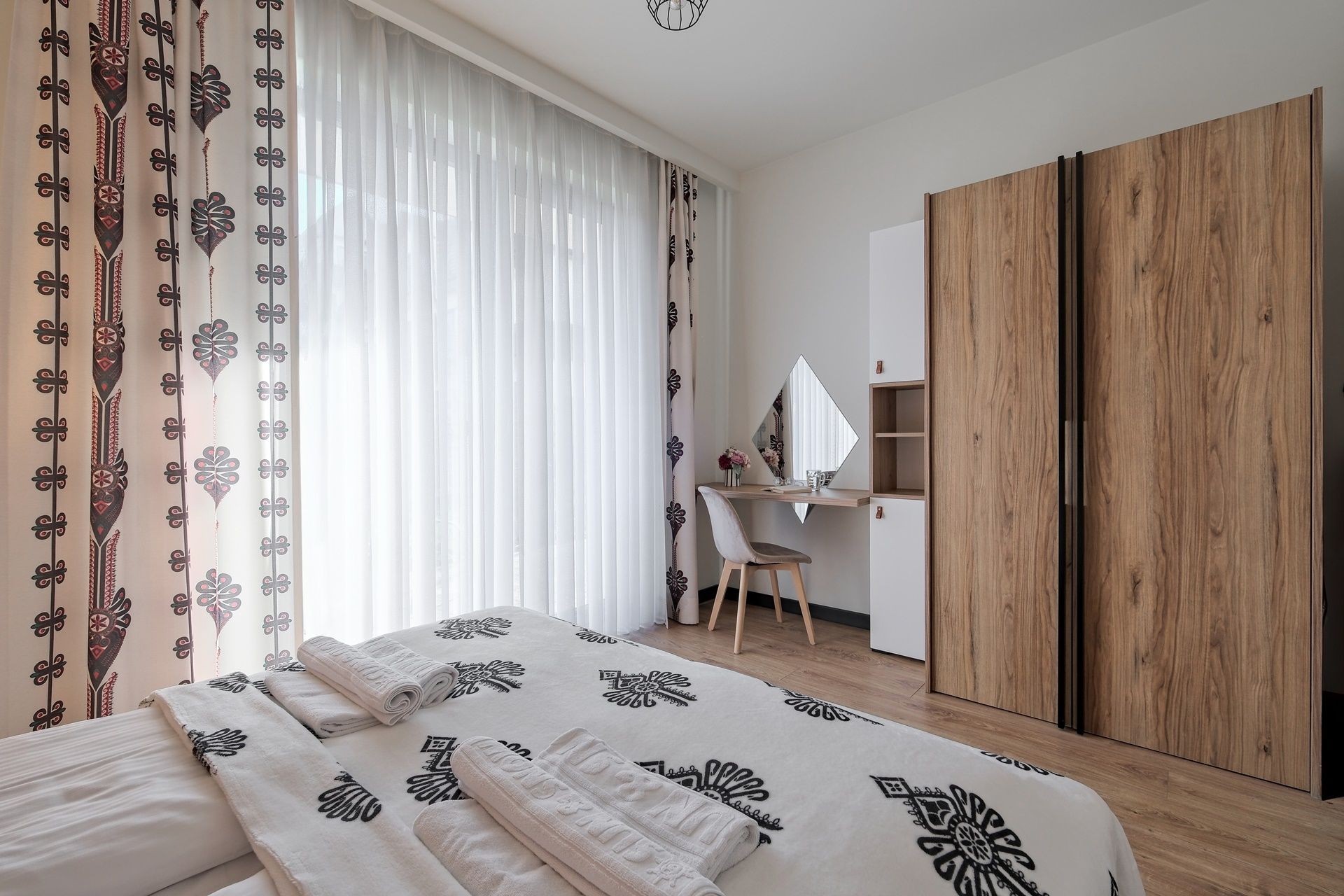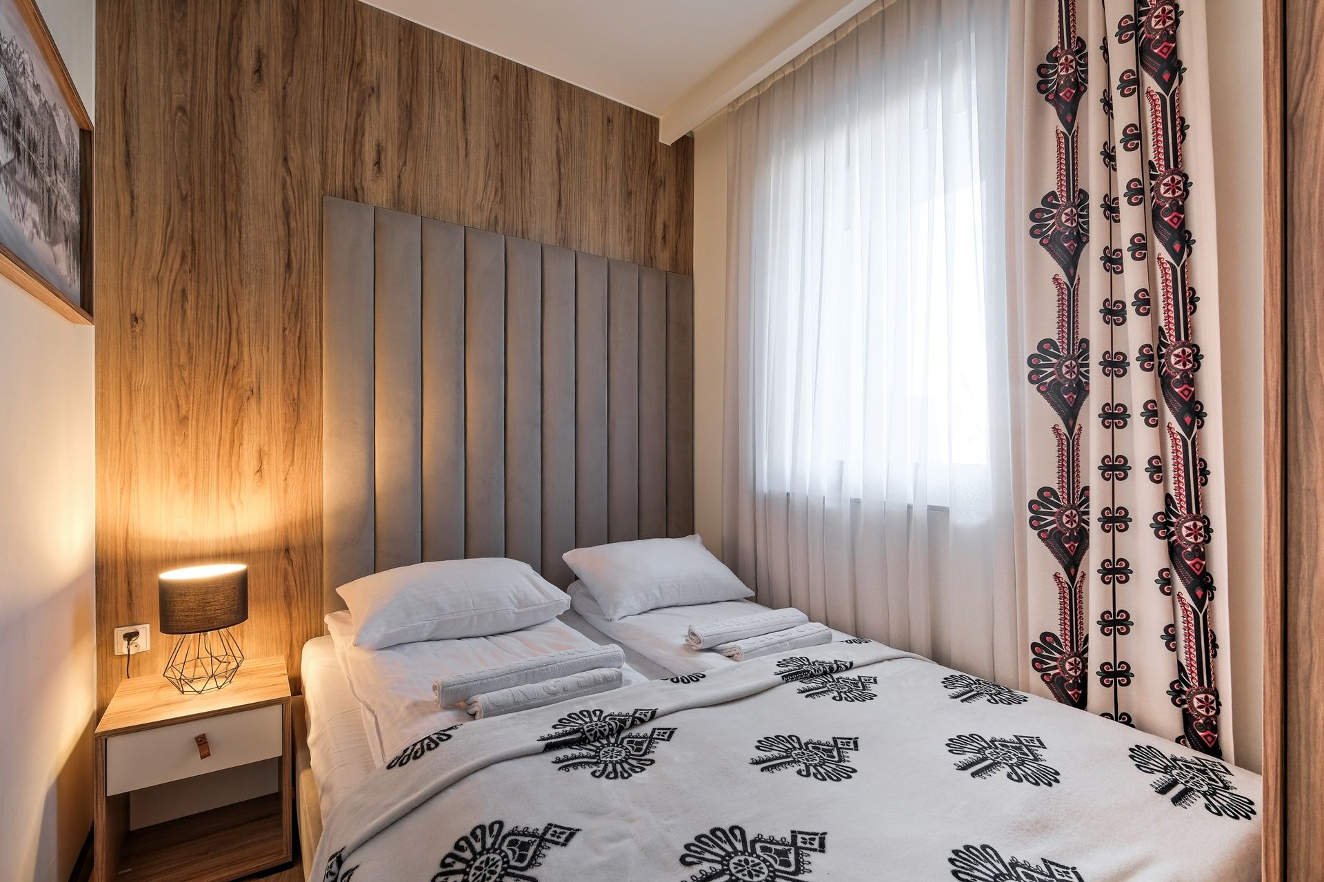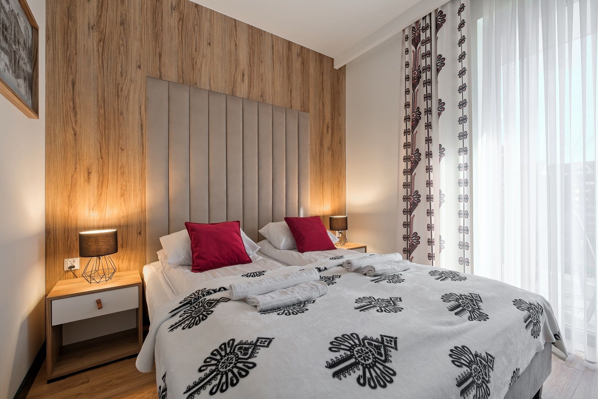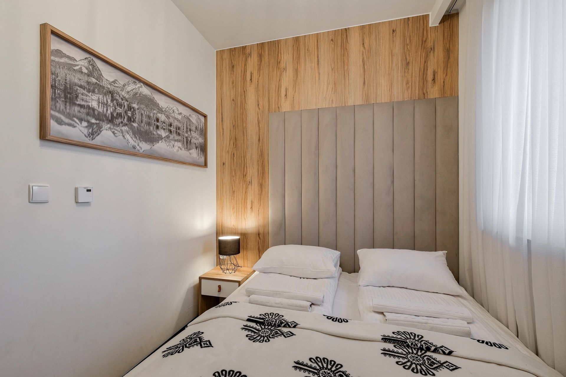 Apartament oferuje dwie oddzielne, przytulne sypialnie, każda w eleganckim stylu z miękkimi tkaninami i drewnianymi wykończeniami.