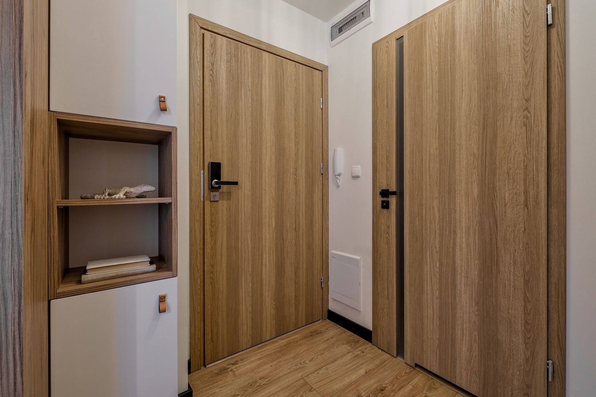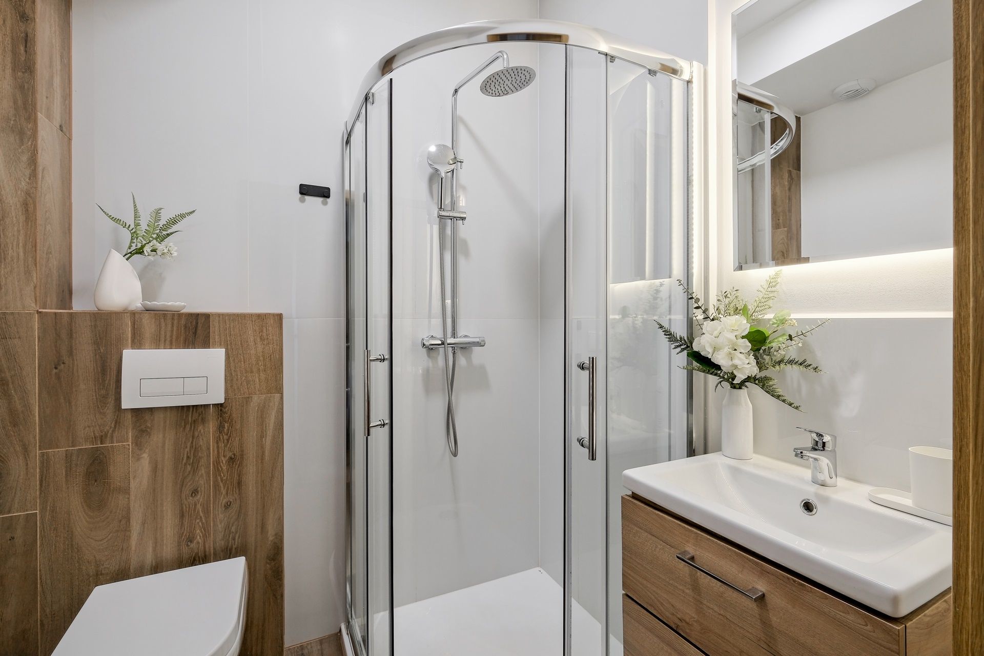 Ciepłe drewniane panele oraz jasne płytki nadają pomieszczeniu harmonijny, relaksujący charakter.