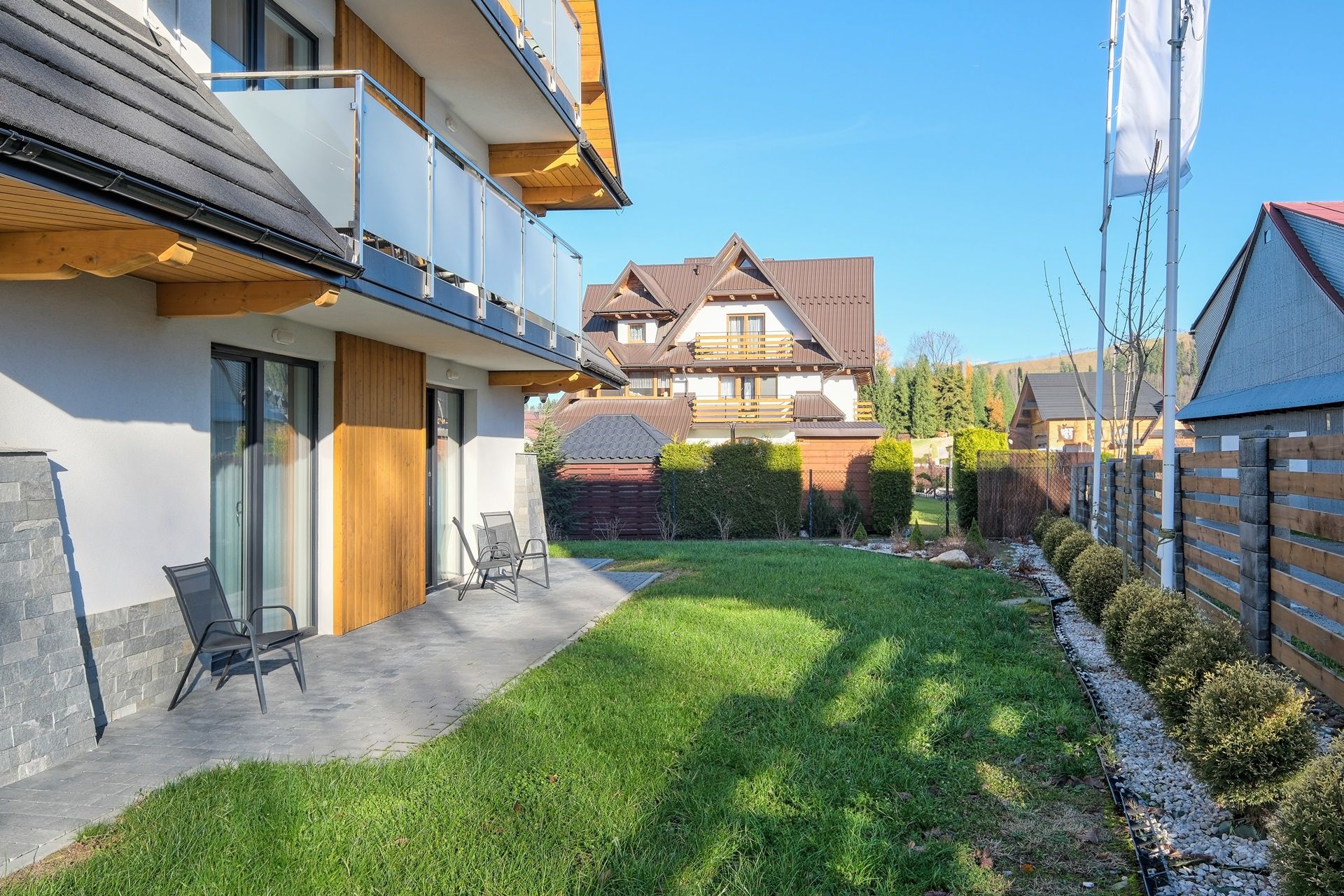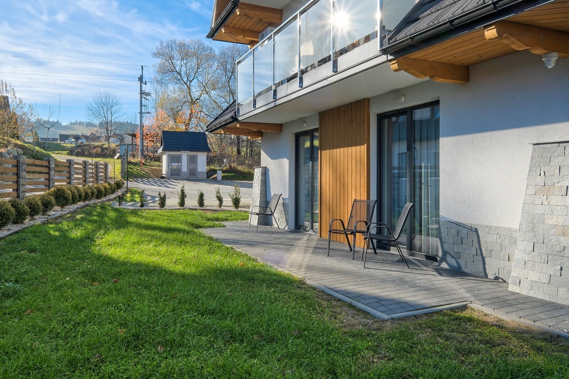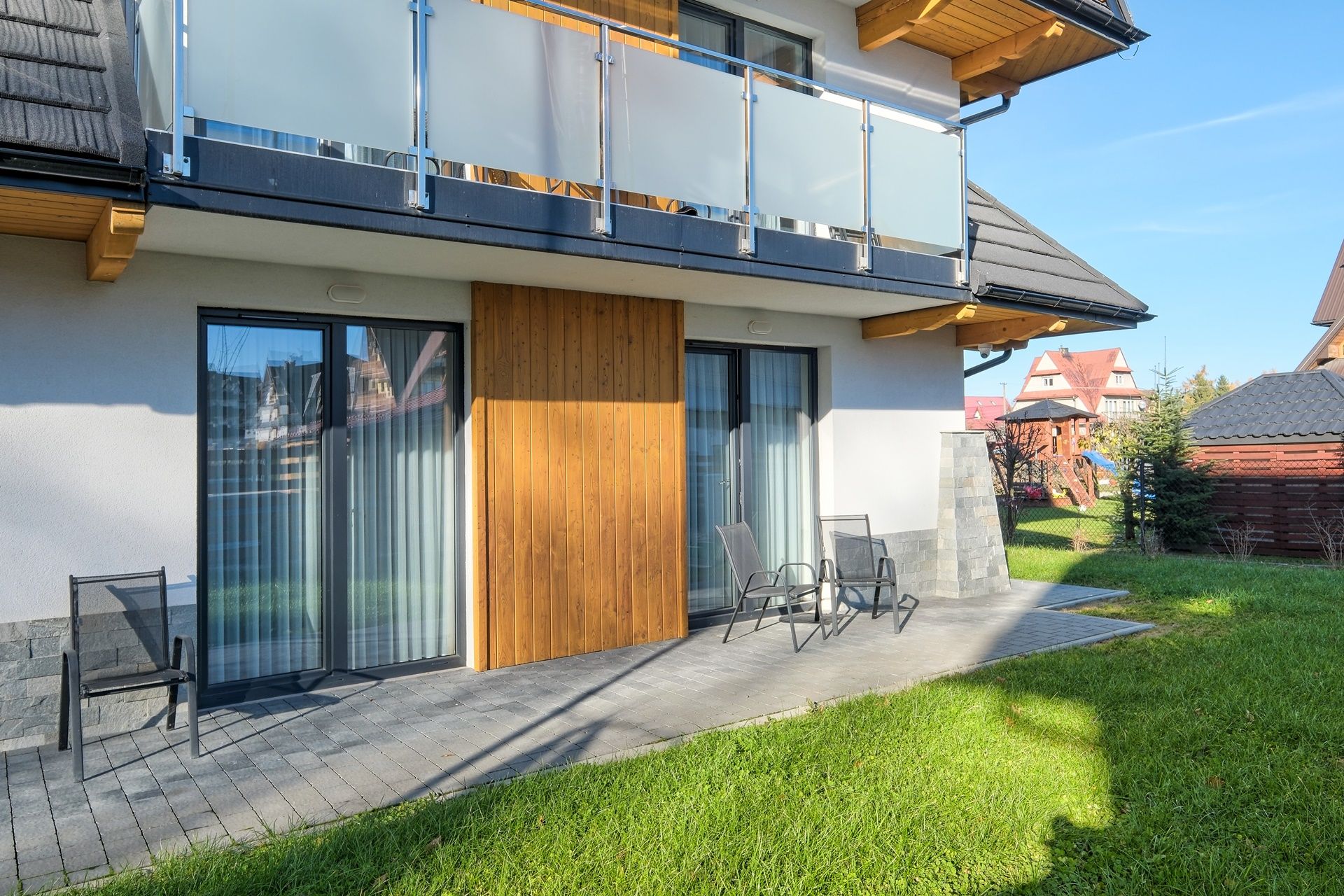 Bezpośrednio z salonu oraz jednej z sypialni można wyjść na taras z widokiem na ogród. To świetne miejsce na poranną kawę lub wieczorny odpoczynek przy zachodzie słońca.