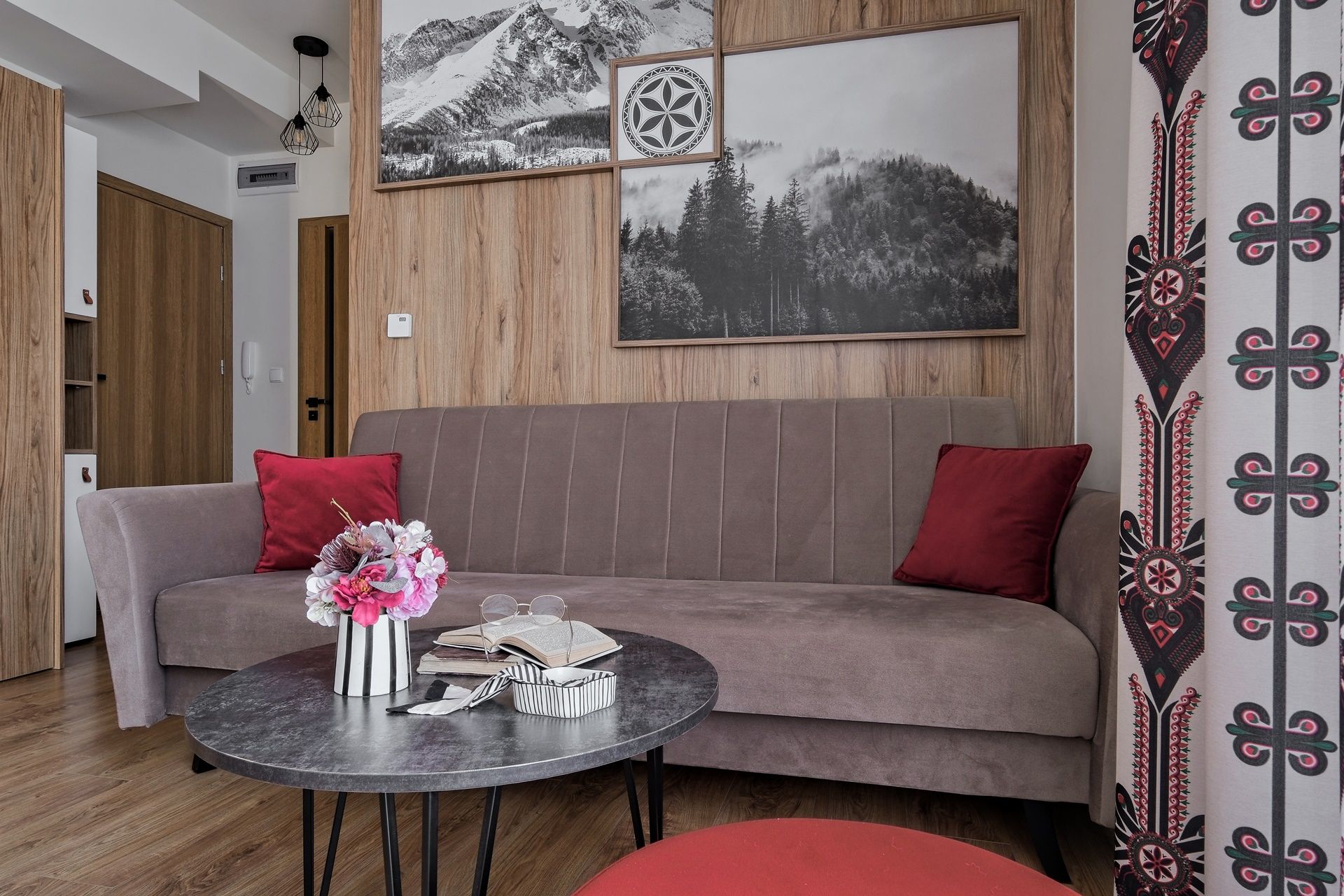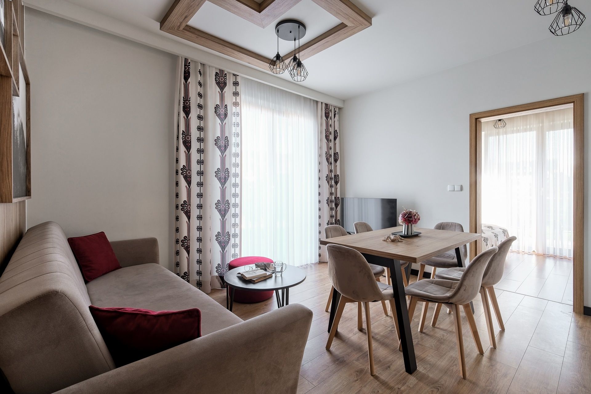 Przestronny salon to serce apartamentu – znajduje się tu wygodna, rozkładana sofa, stolik kawowy oraz telewizor, tworzące idealne miejsce do odpoczynku. Duże przeszklenia zapewniają piękne naturalne światło i wyjście wprost na taras z miejscem do siedzenia.