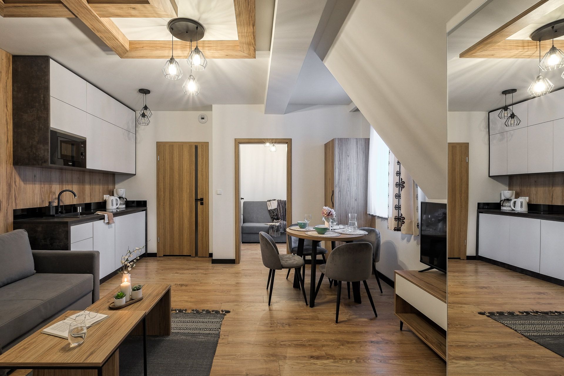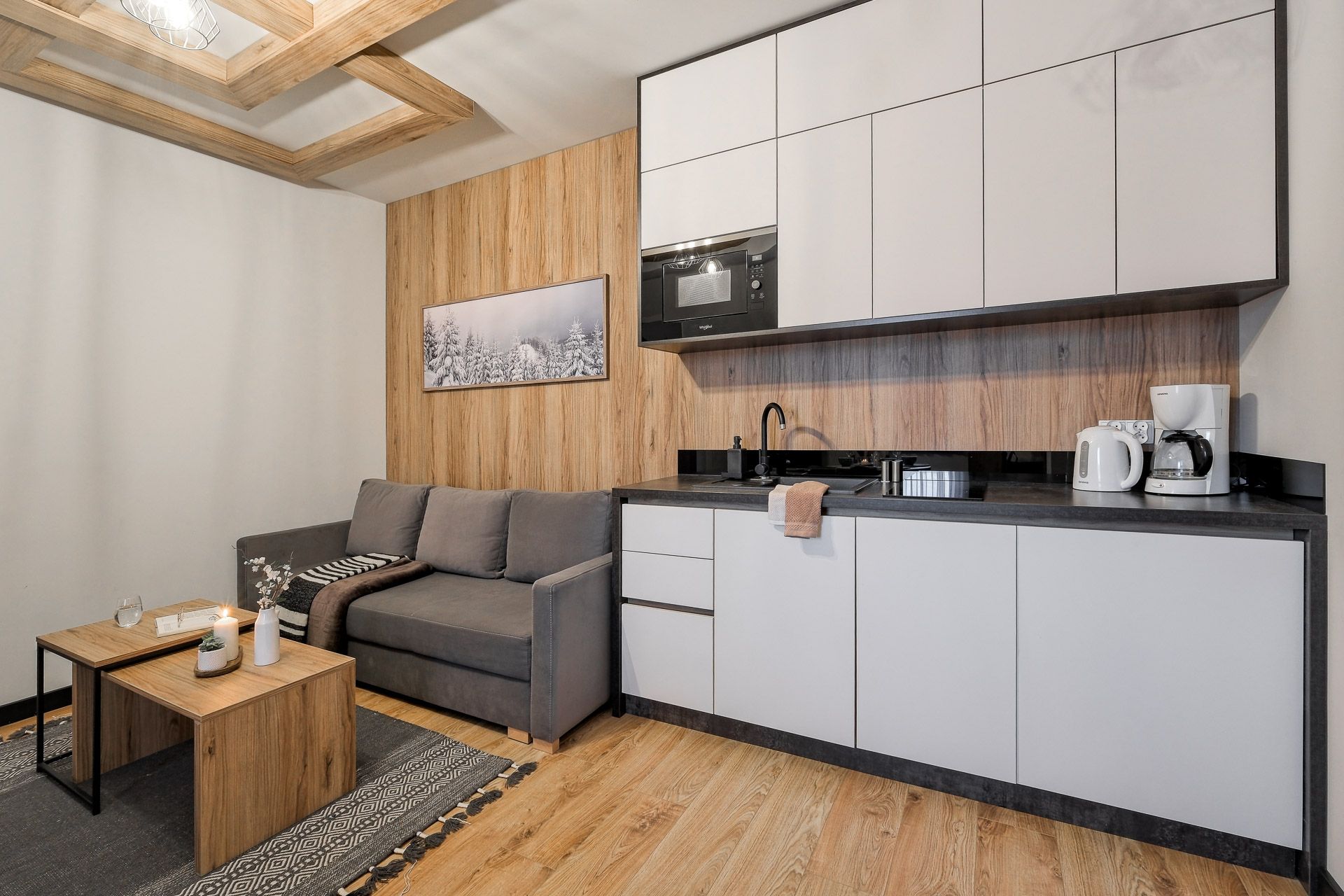 Nowoczesny aneks kuchenny umożliwia wygodne przygotowywanie posiłków. Do dyspozycji Gości są m.in.: