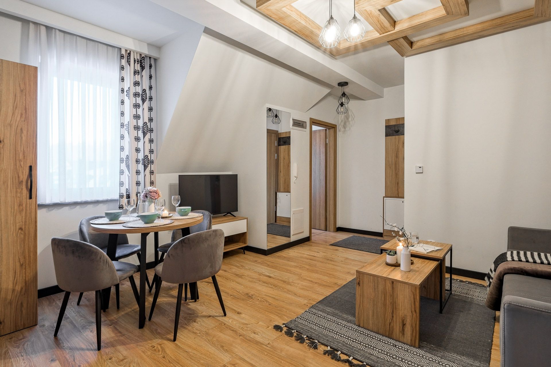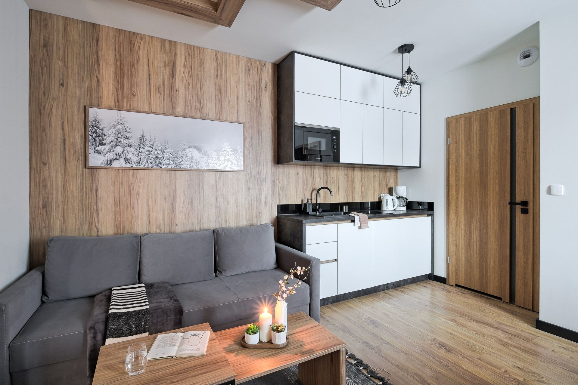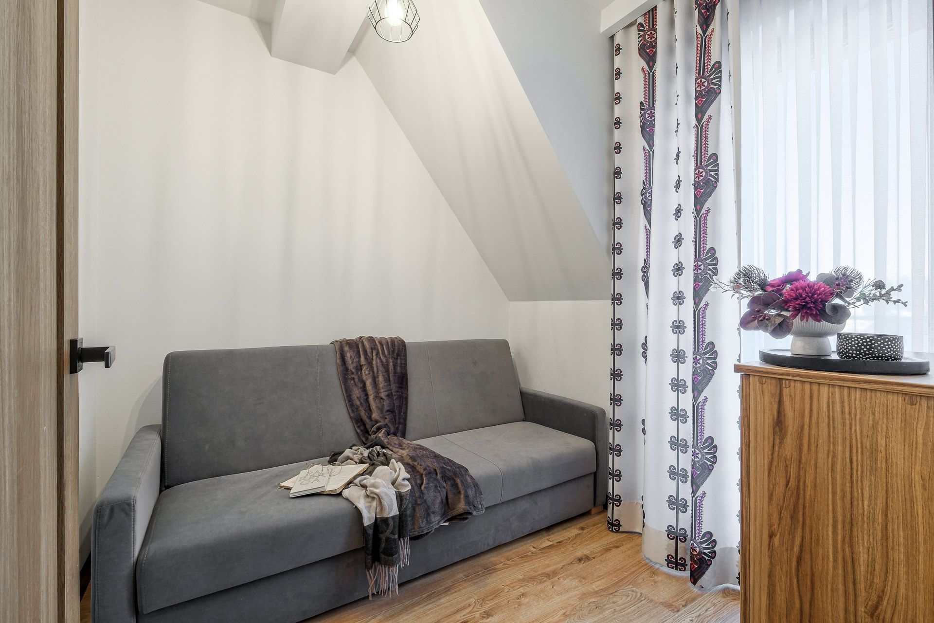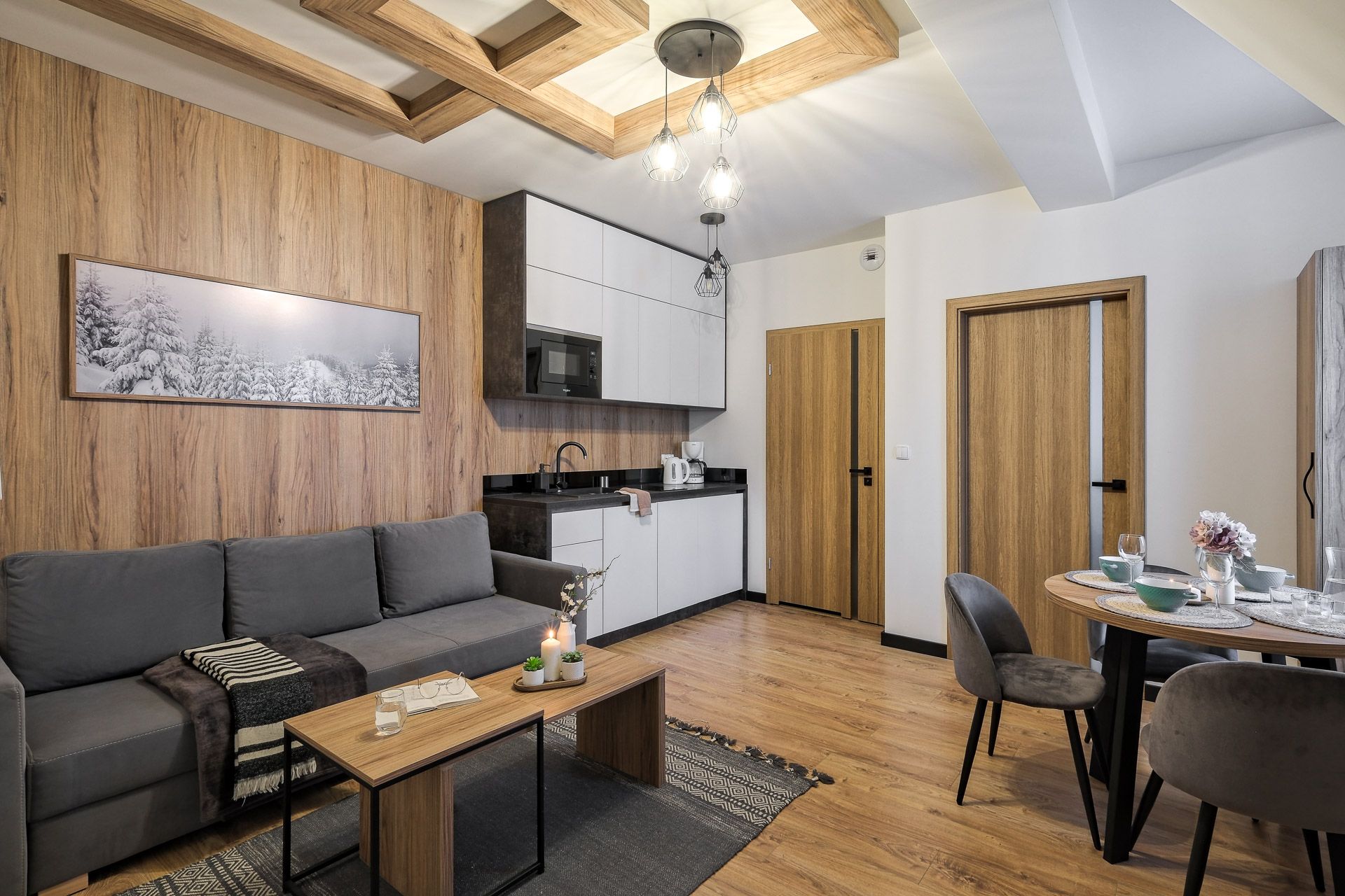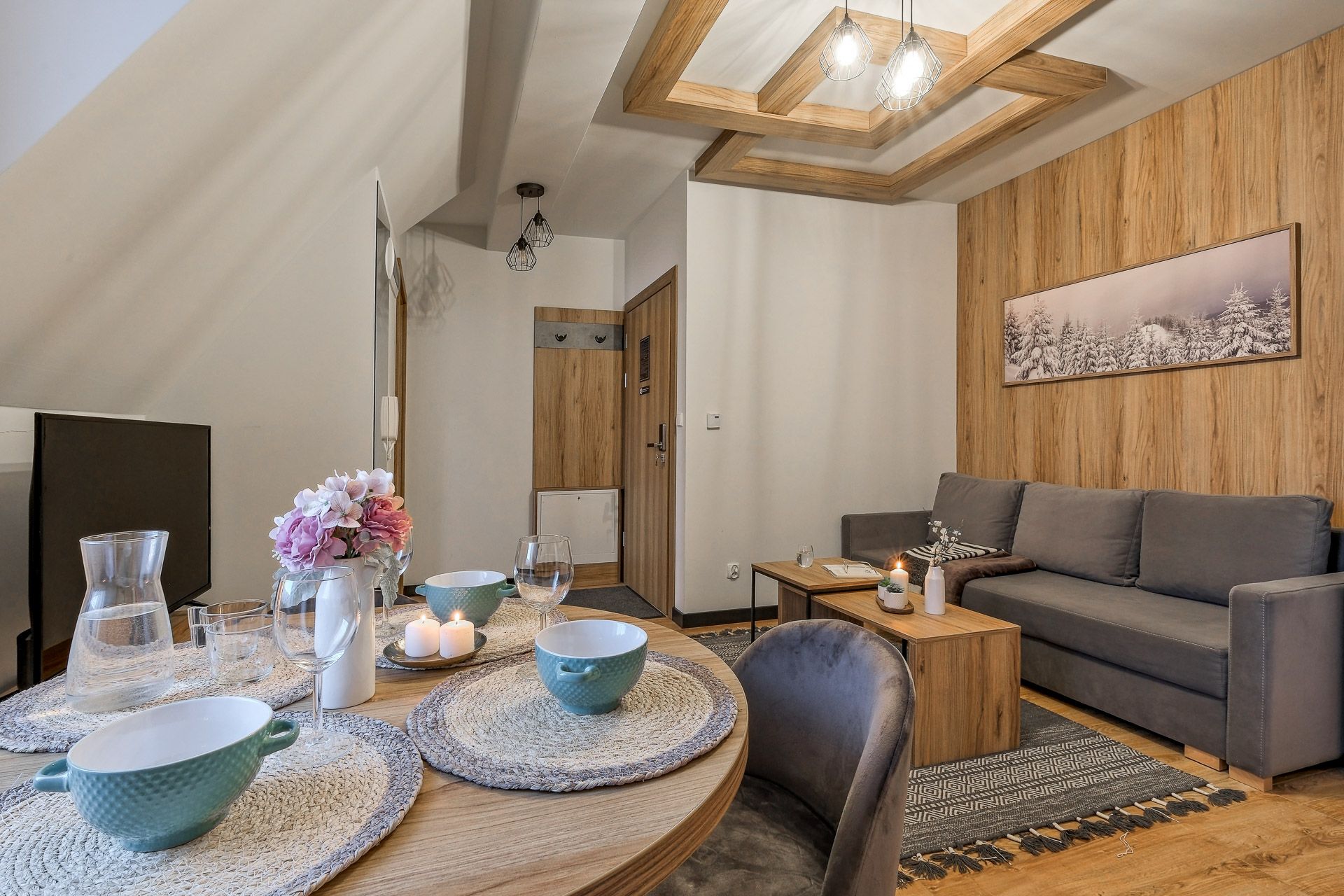Salon stanowi centralną część apartamentu. Znajduje się tu wygodna, rozkładana sofa, która po rozłożeniu zapewnia dodatkowe miejsca do spania, stolik kawowy oraz telewizor z płaskim ekranem - idealne warunki do wieczornego relaksu po dniu spędzonym w górach.