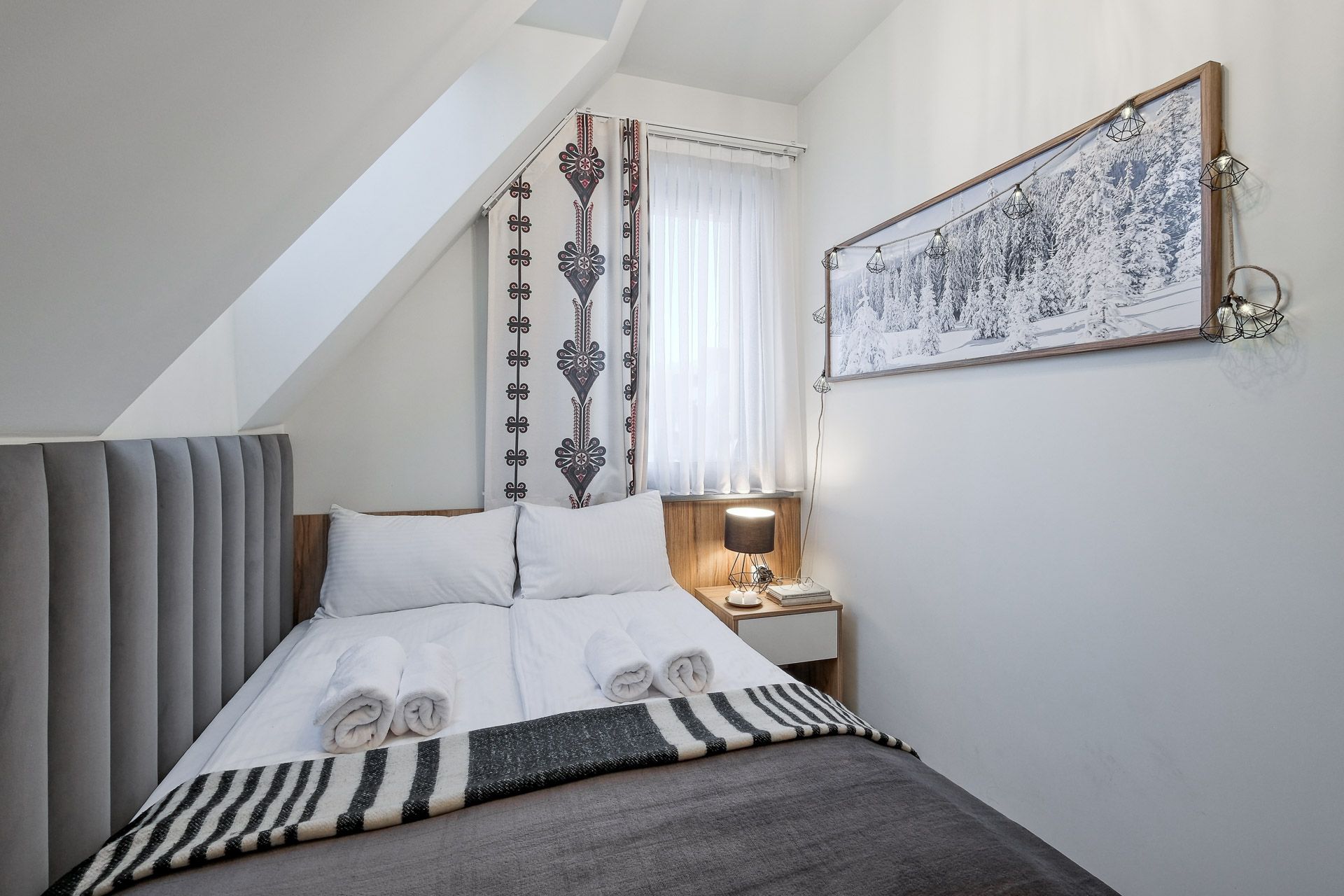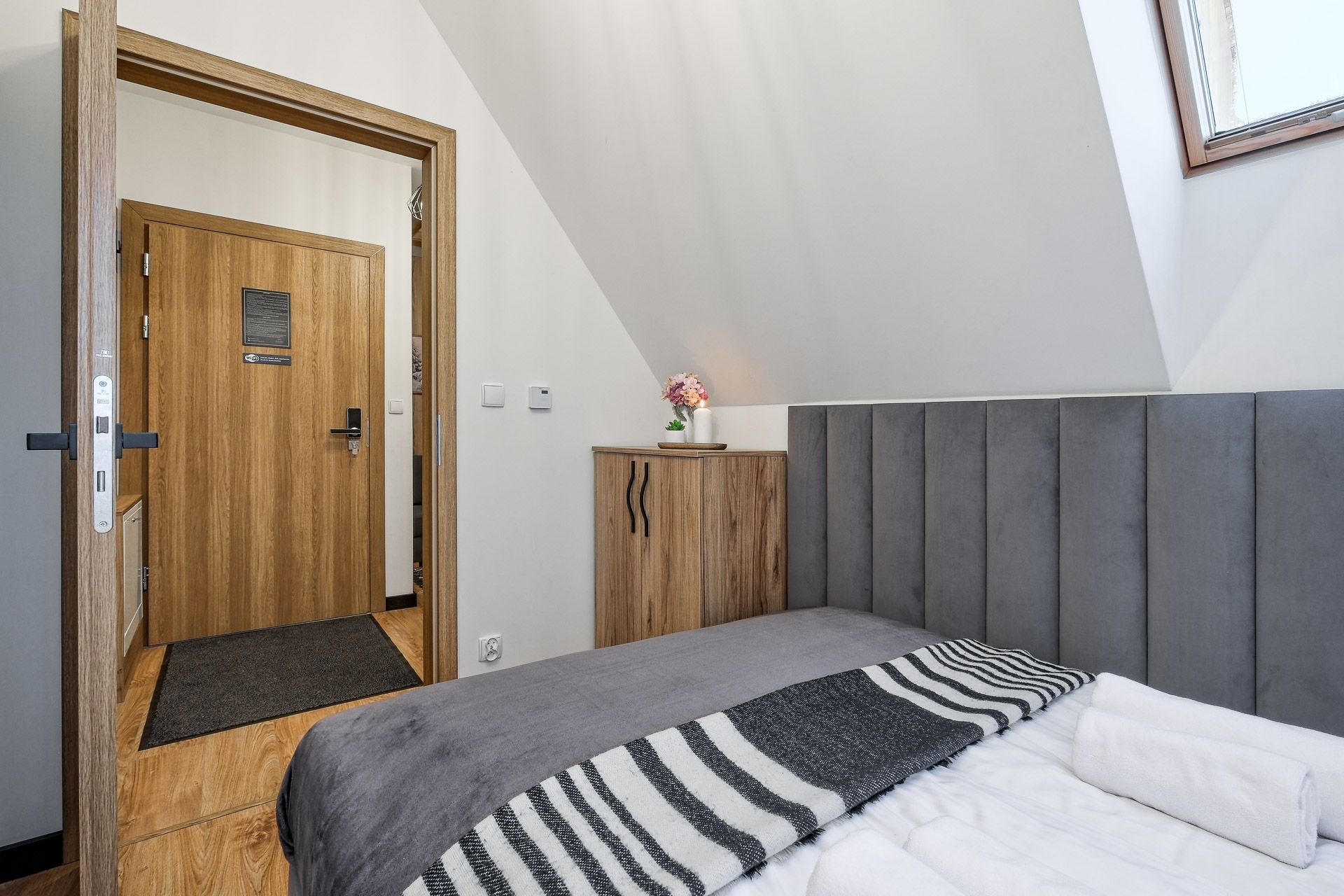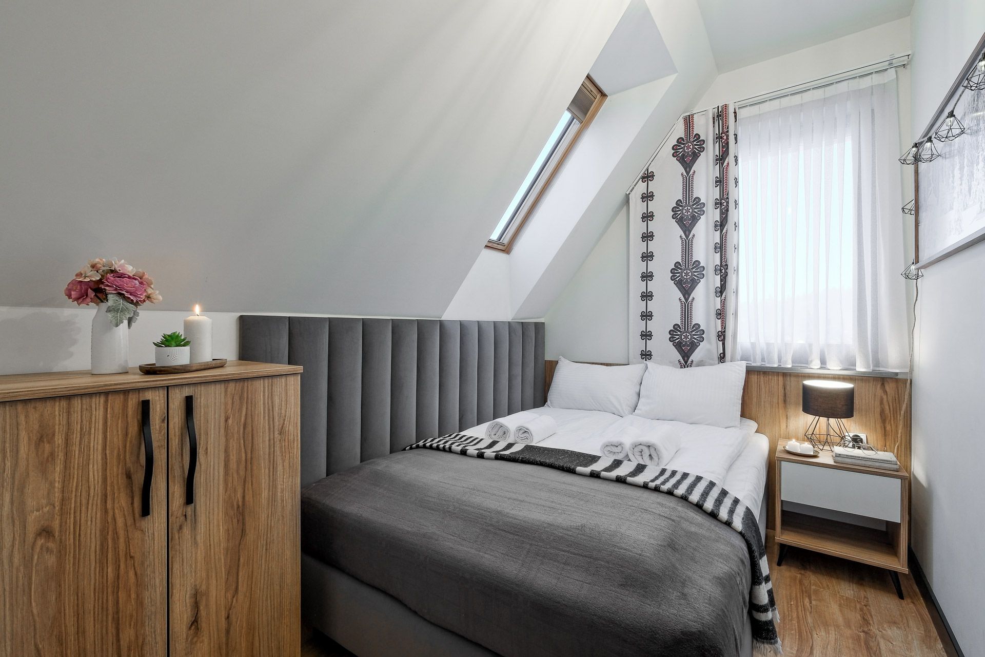 1 sypialnia- duże, wygodne łóżko w standardzie hotelowym, miękki zagłówek, nastrojowe oświetlenie oraz praktyczne szafki nocne.