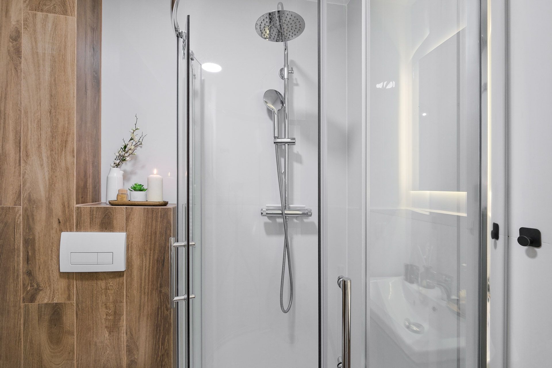 Elegancka łazienka urządzona jest w jasnych, naturalnych barwach i oferuje: