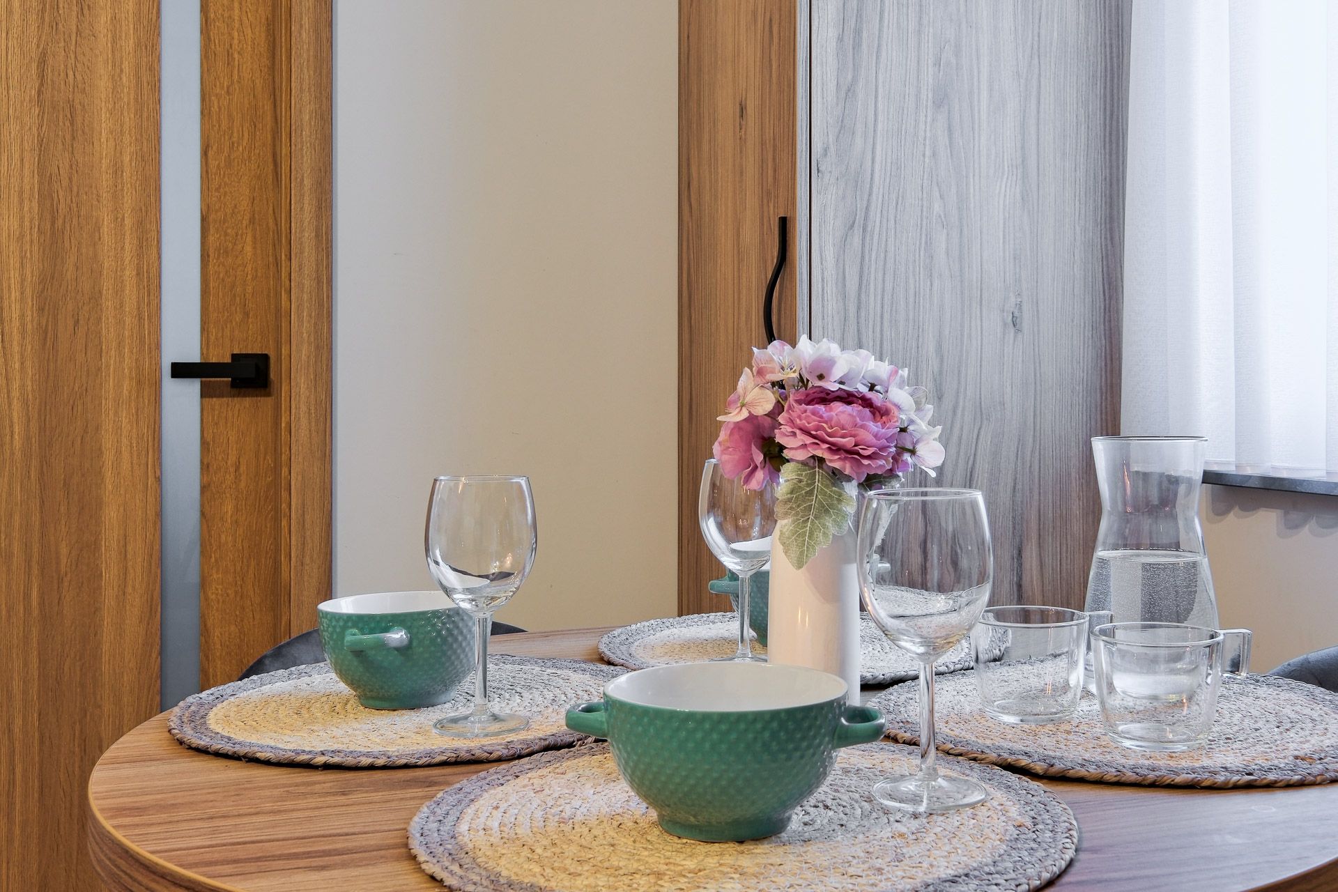 Część jadalna wyposażona jest w okrągły stół oraz komfortowe, tapicerowane krzesła, sprzyjające wspólnym posiłkom i długim rozmowom.