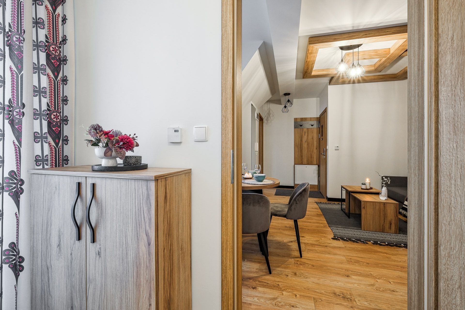 Apartament A18 to nowoczesna, przytulna przestrzeń zaprojektowana z myślą o komforcie dla max 5 osób. Połączenie naturalnego drewna, jasnych kolorów oraz subtelnych górskich akcentów tworzy ciepłą, relaksującą atmosferę - idealną zarówno na rodzinny wypoczynek, jak i wyjazd z przyjaciółmi. Funkcjonalny układ oraz pełne wyposażenie sprawiają, że apartament doskonale sprawdzi się o każdej porze roku.
