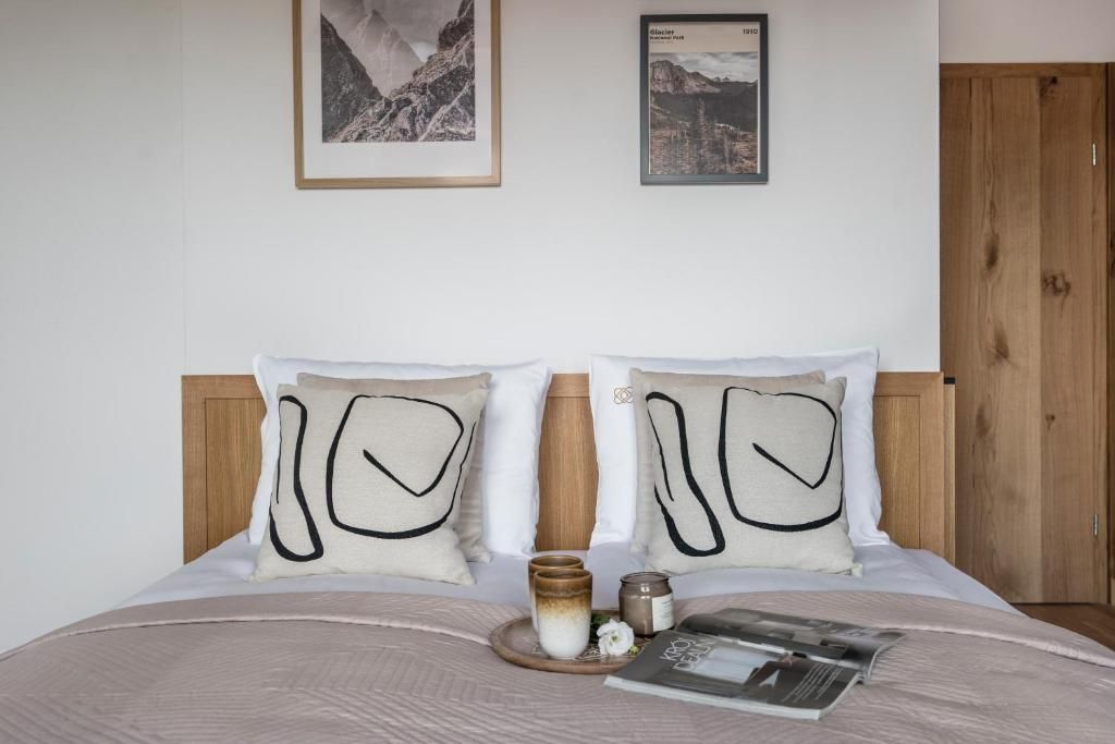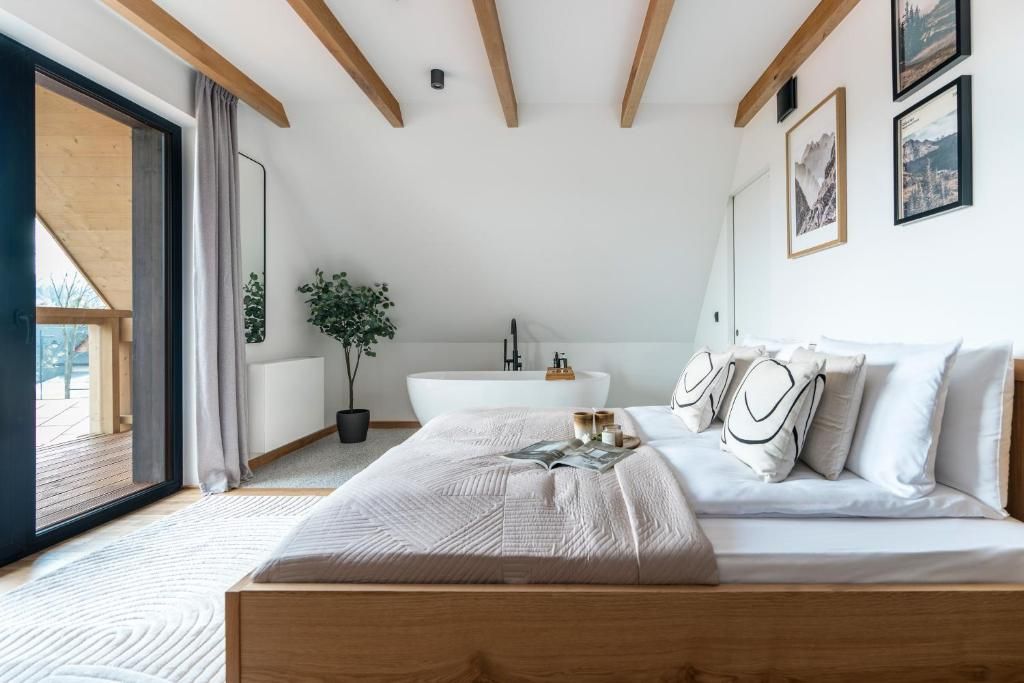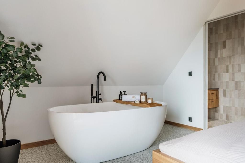 Wyjątkowym elementem apartamentu jest elegancka, wolnostojąca wanna ustawiona bezpośrednio przy łóżku, w otwartej strefie sypialnianej. To rozwiązanie tworzy niepowtarzalny klimat relaksu i nadaje wnętrzu charakteru prywatnego spa.