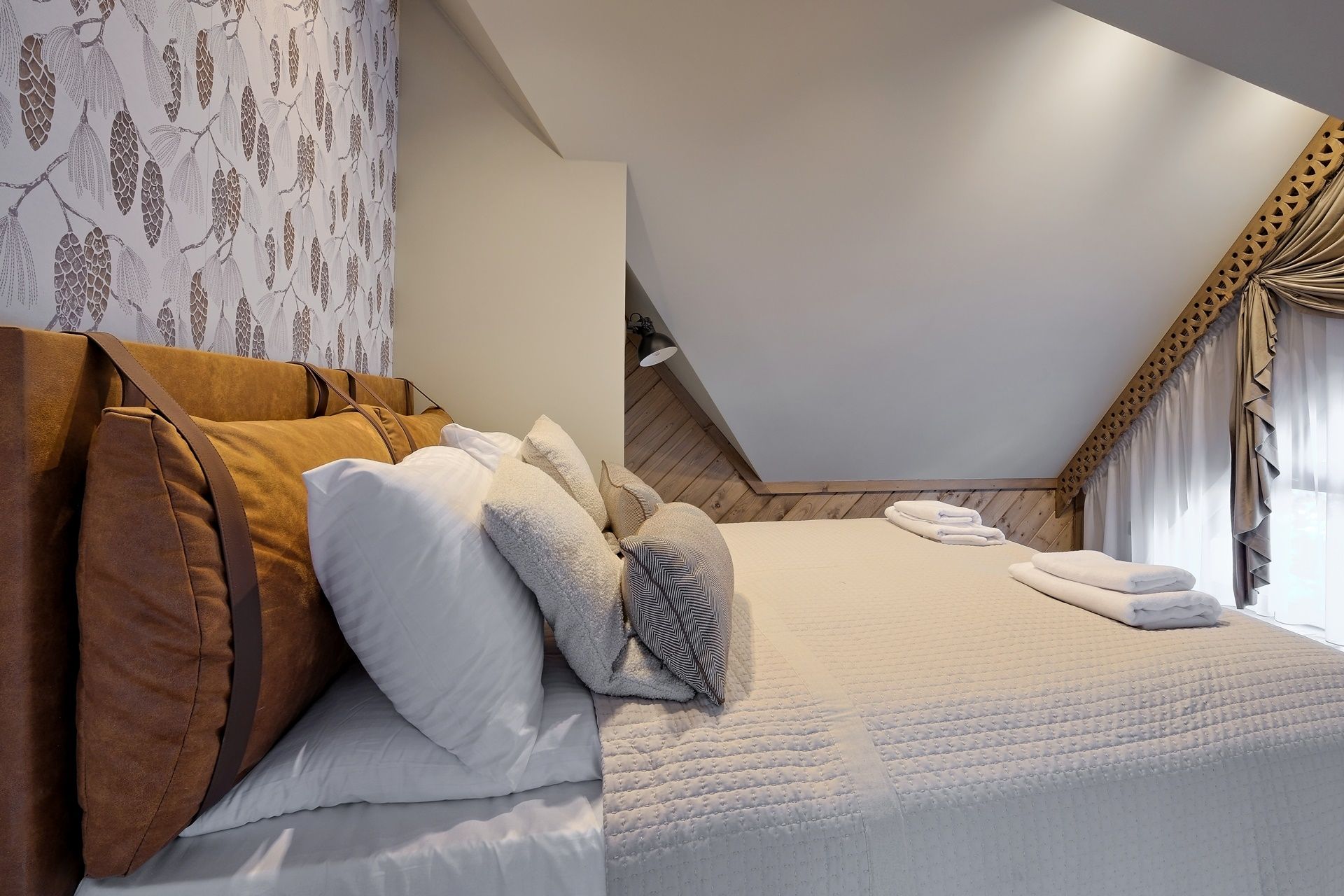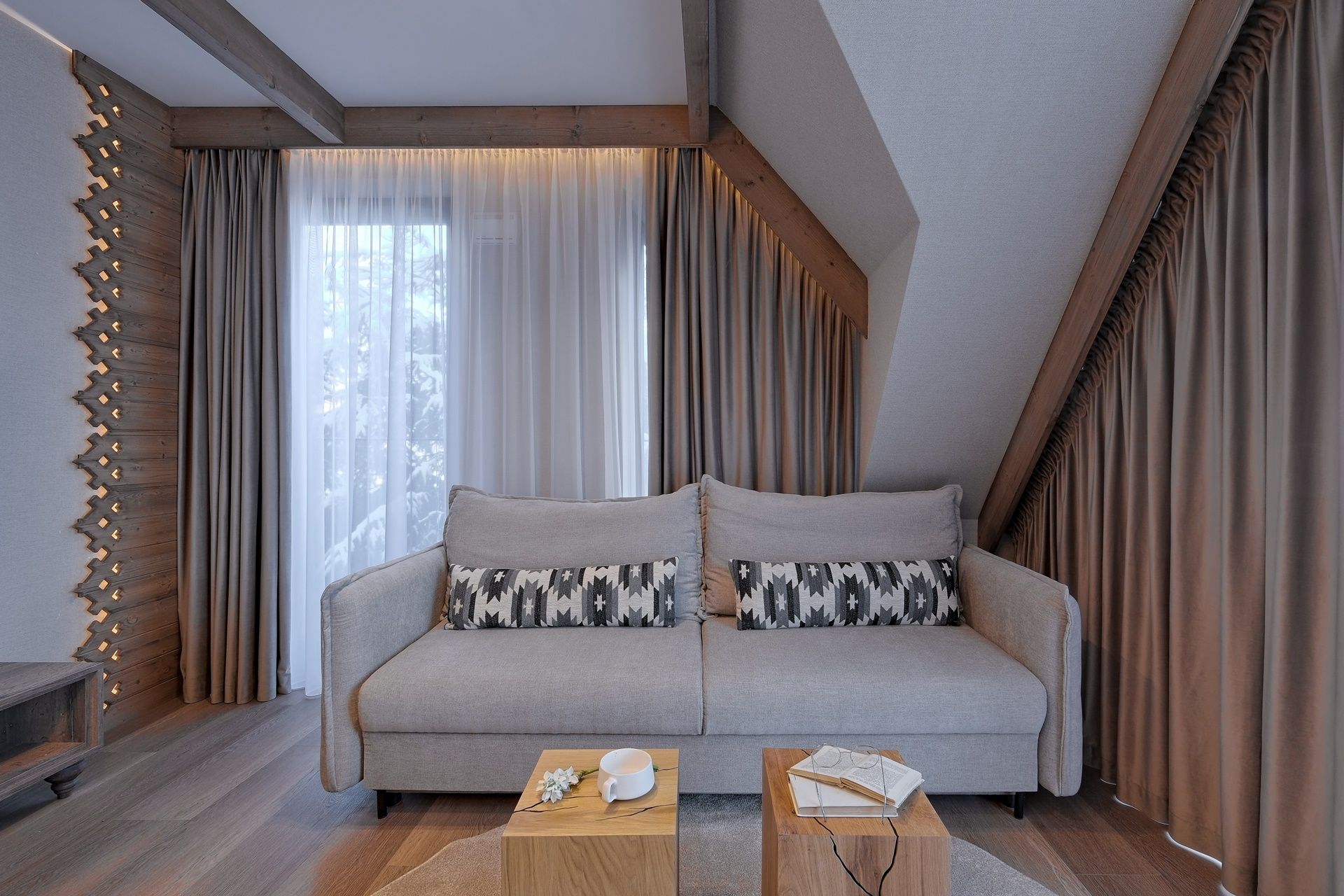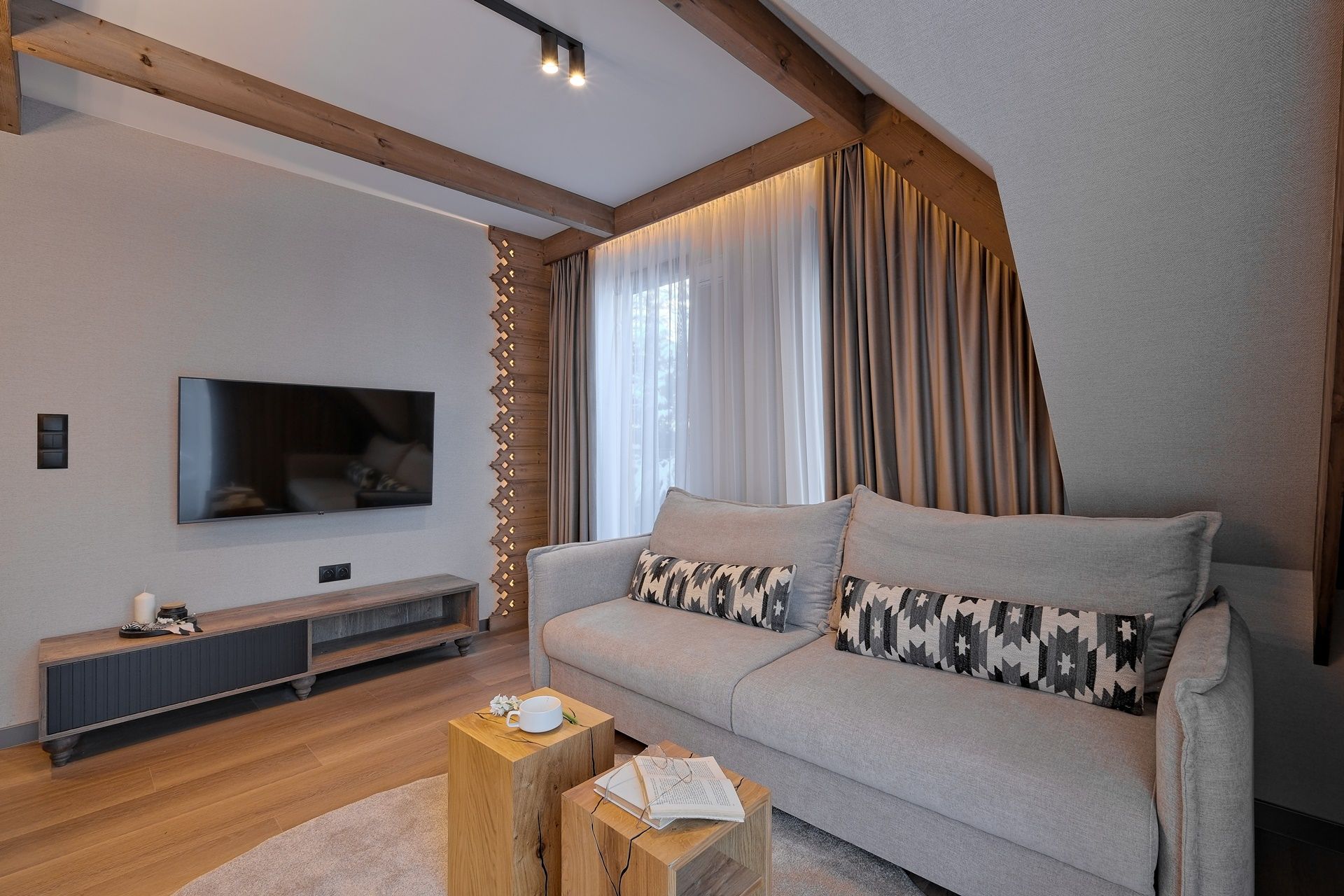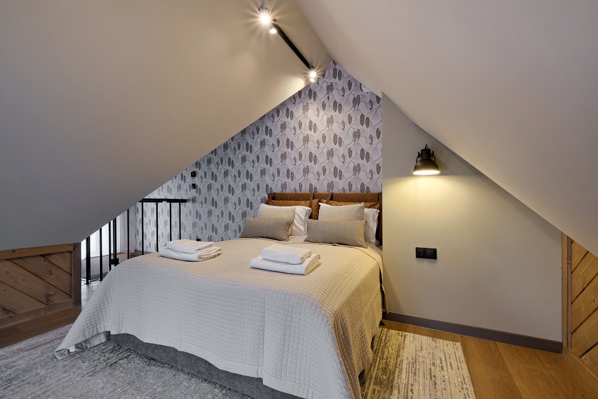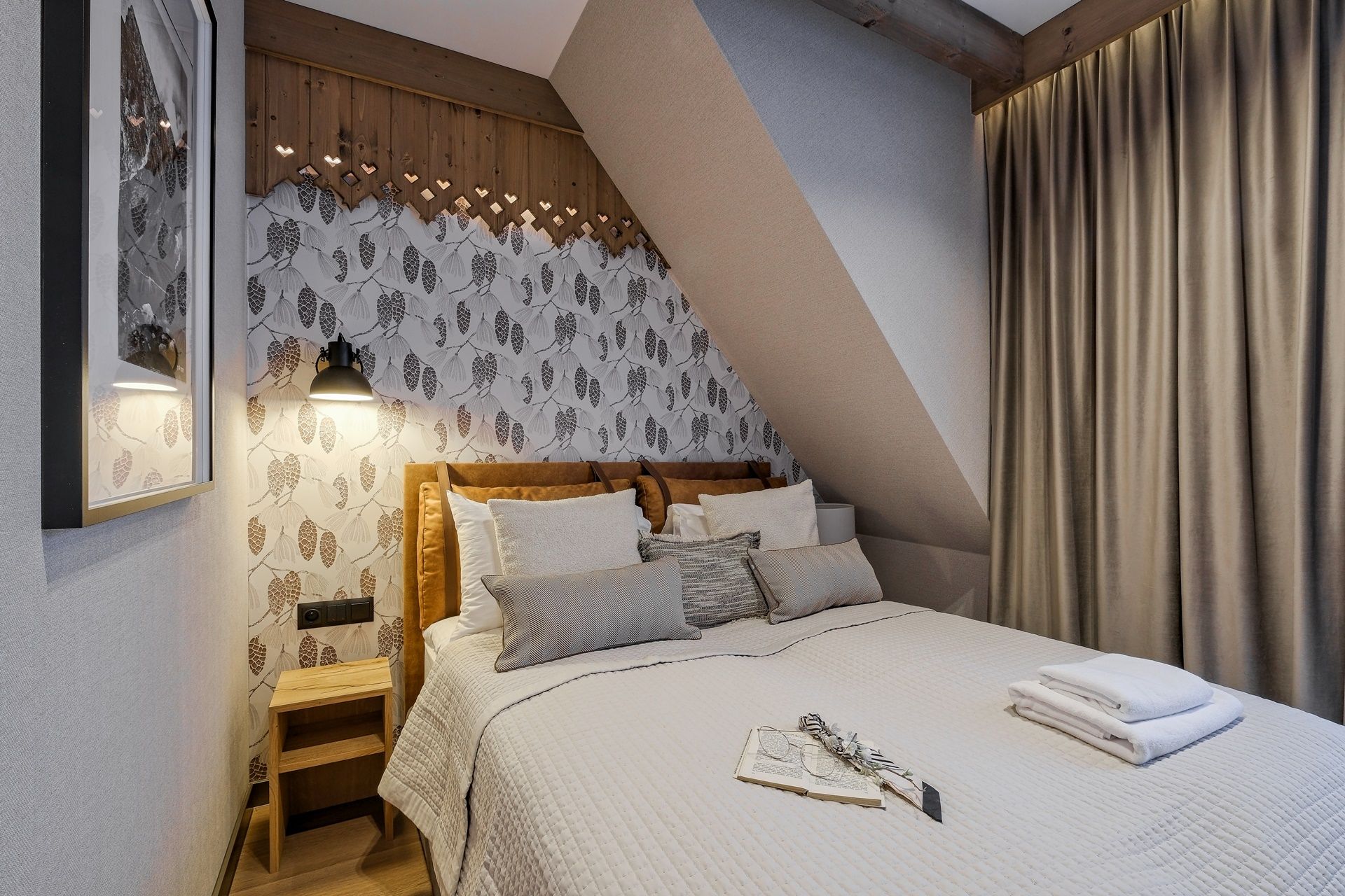 Apartament zachwyca dopracowanymi detalami oraz stonowaną, naturalną kolorystyką. Drewniane akcenty, miękkie tkaniny i designerskie oświetlenie tworzą przytulny, górski klimat.