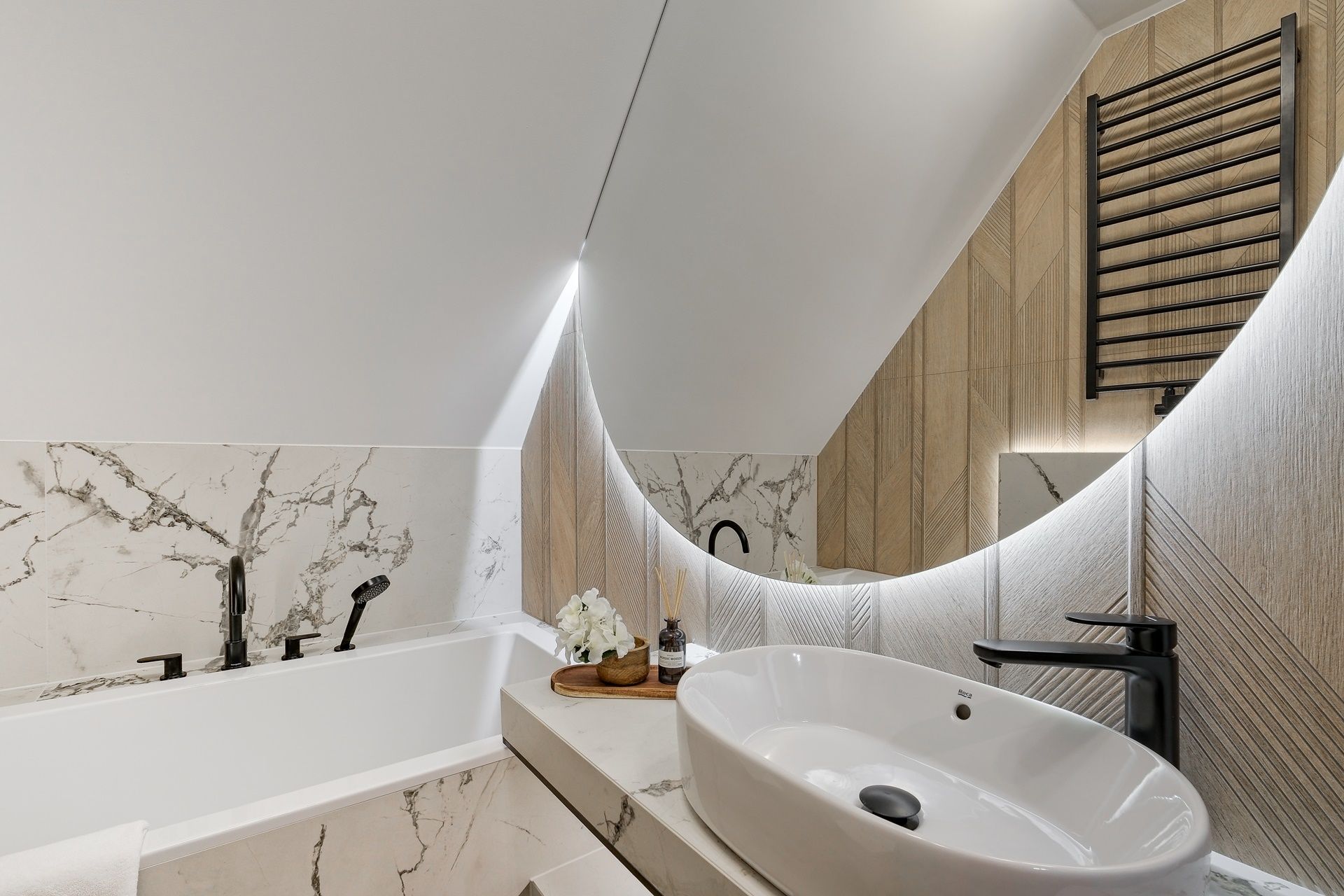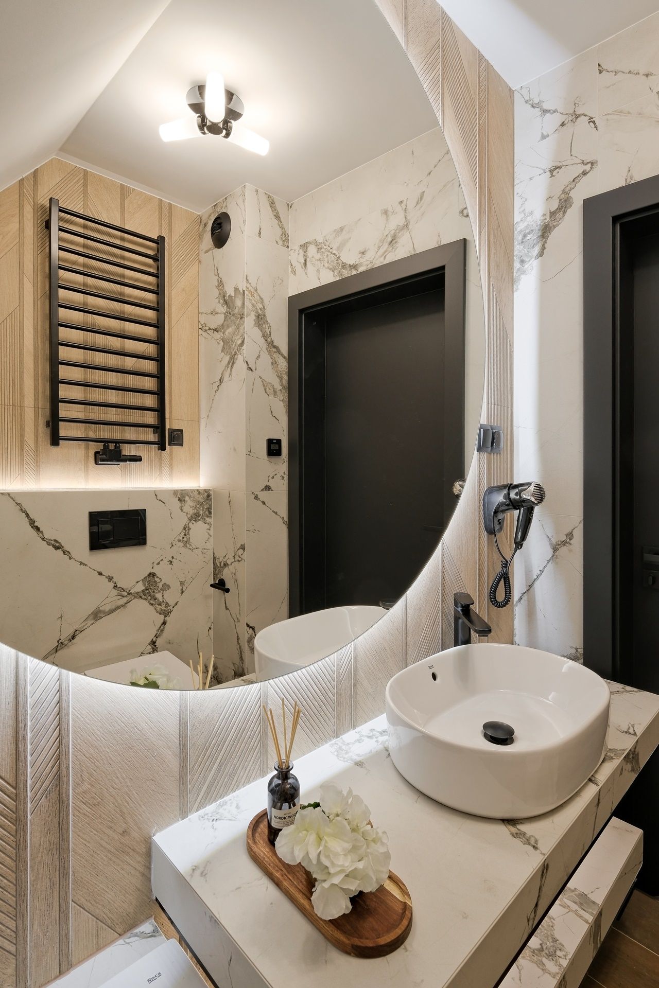 Łazienka w standardzie premium została wykończona kamieniem, podświetlanym lustrem oraz nowoczesną czarną armaturą.