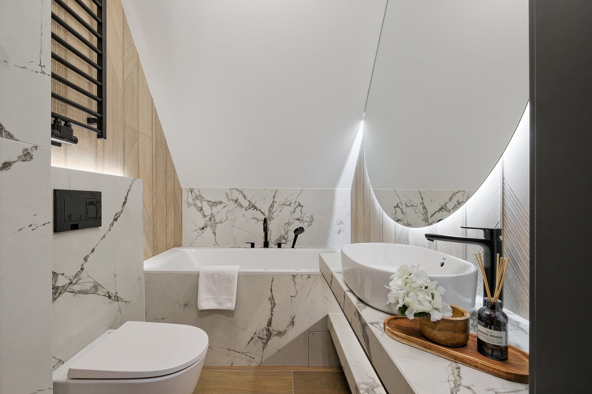 • Łazienka: eleganckie wnętrze z czarnym kamieniem, wanna, WC i umywalka
