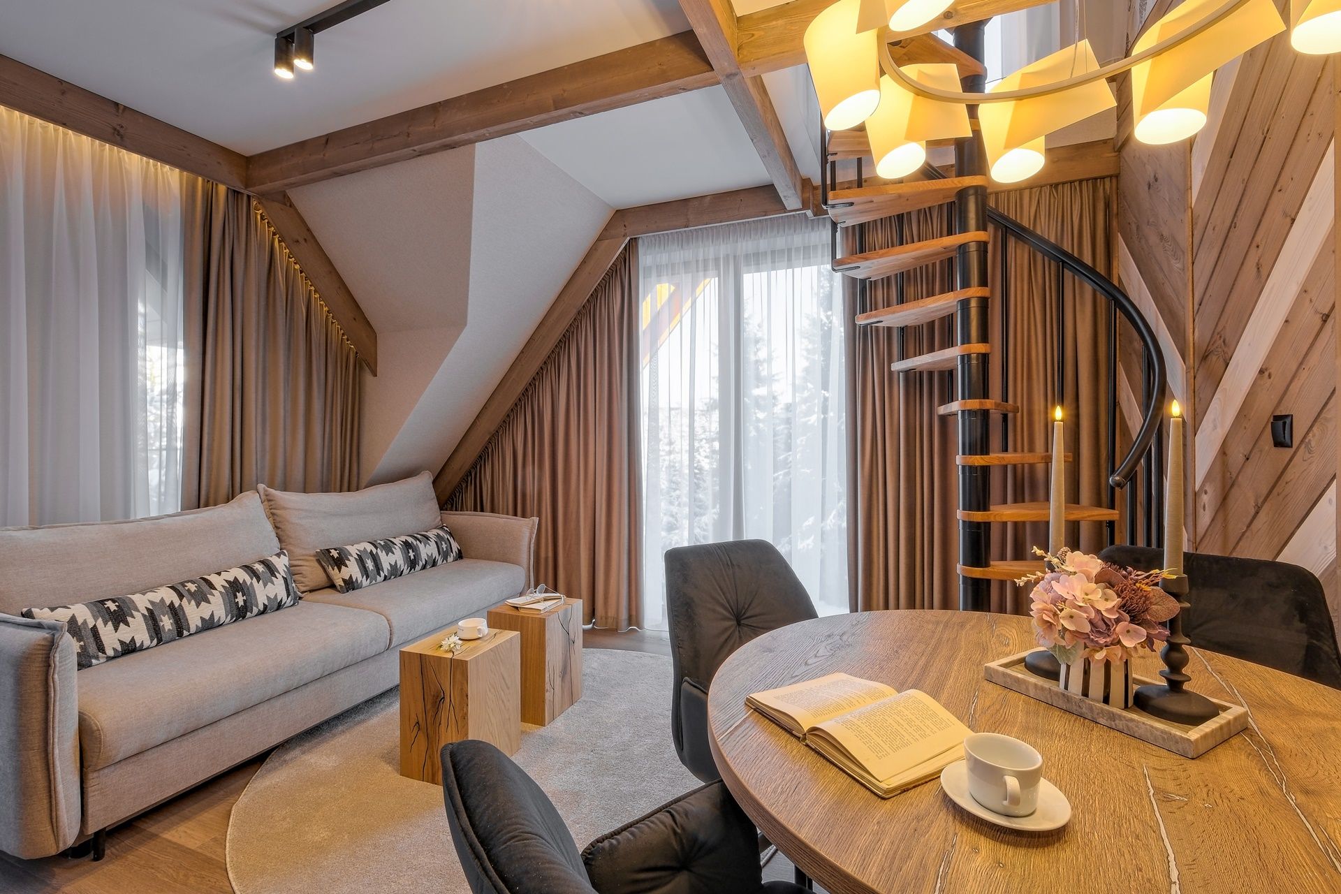 Dwupoziomowy apartament 6-osobowy to idealne połączenie przestrzeni, komfortu i nowoczesnego górskiego stylu. Doskonały na rodzinne wyjazdy, pobyt dwóch par lub odpoczynek w większym gronie.