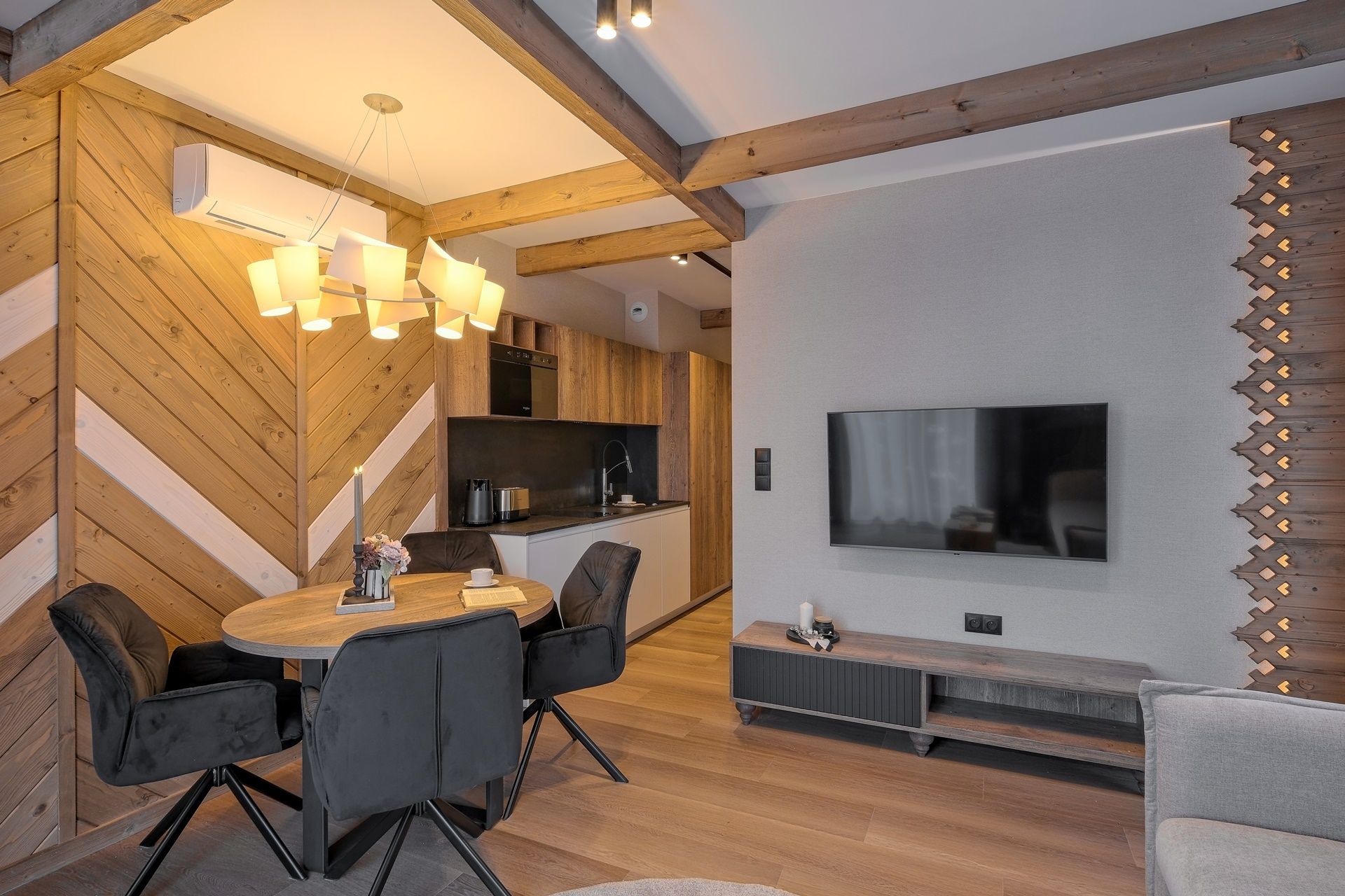 To harmonijnie zaprojektowana przestrzeń, w której nowoczesna forma spotyka się z ciepłem górskich akcentów. Apartament przeznaczony jest dla osób ceniących wygodę, estetykę i wysoką jakość wykończenia – idealny dla rodzin, par oraz grup przyjaciół.