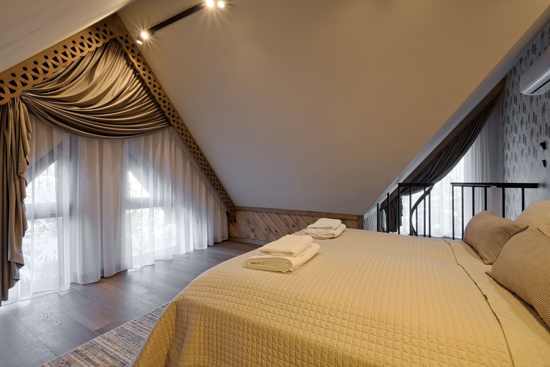 • Sypialnia II: przestronna, przytulna sypialnia z łóżkiem małżeńskim, nastrojowym oświetleniem i elementami z naturalnego drewna