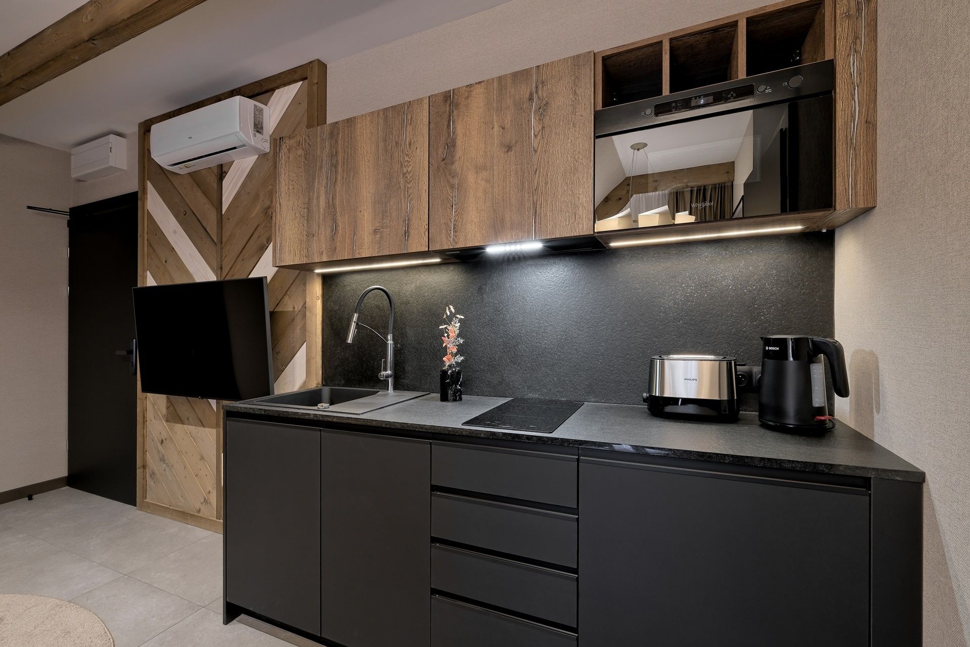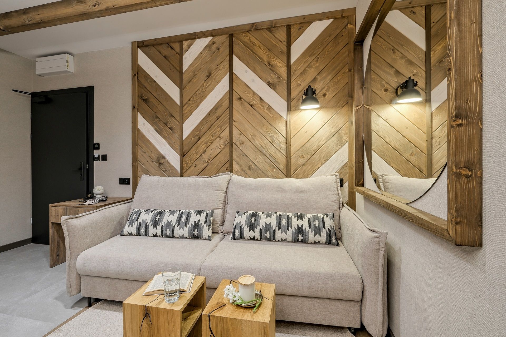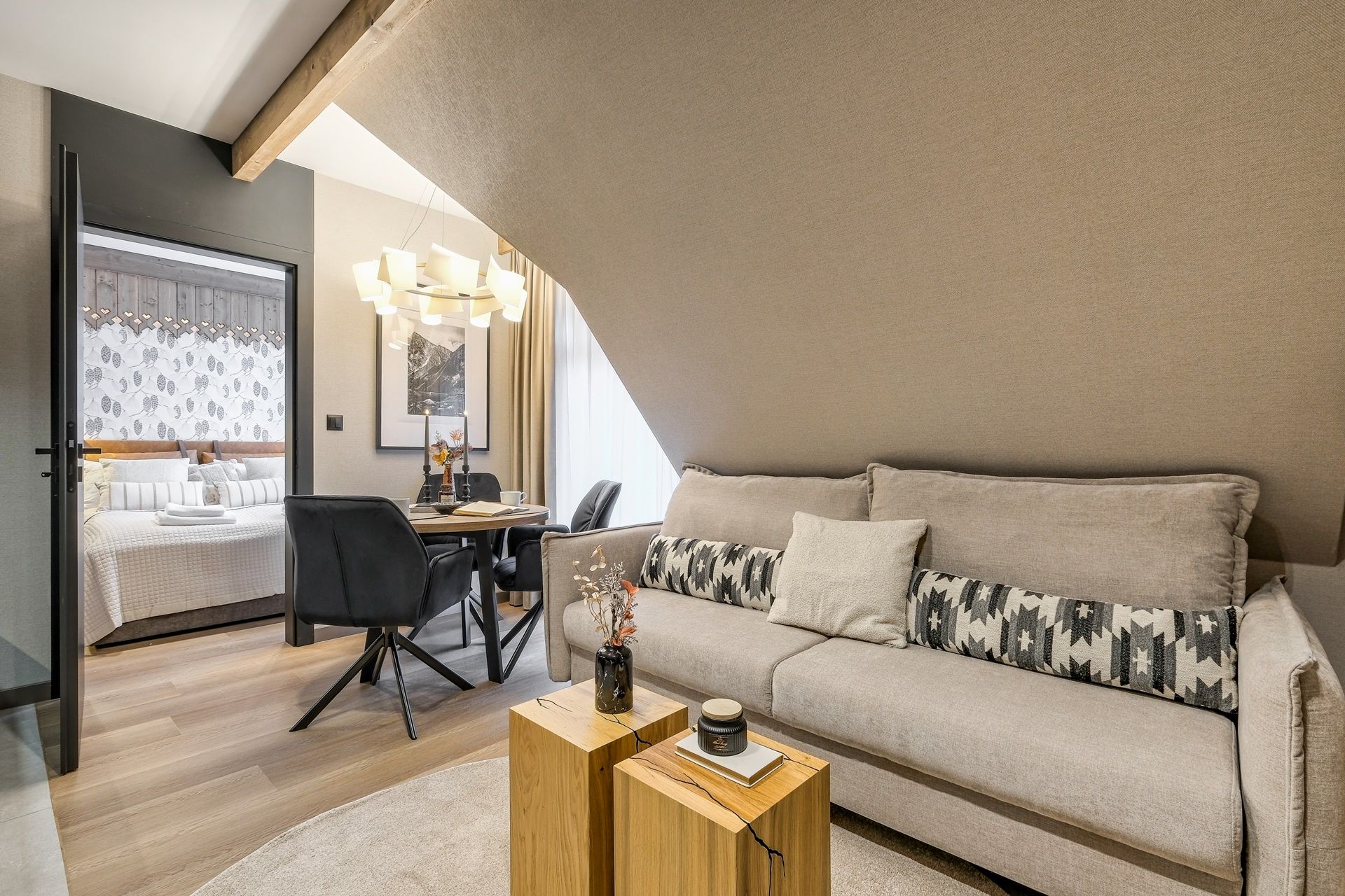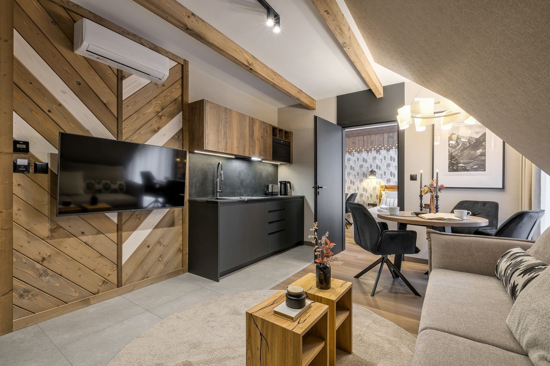 Apartament zachwyca dopracowanymi detalami oraz nastrojową kolorystyką. Naturalne drewno, miękkie tkaniny i designerskie oświetlenie tworzą atmosferę sprzyjającą relaksowi. Przestrzeń dzienna została zaprojektowana z myślą o funkcjonalności – wygodna sofa, elegancki stół jadalniany oraz aneks kuchenny w ciemnej, nowoczesnej tonacji tworzą stylową, a zarazem przytulną całość.