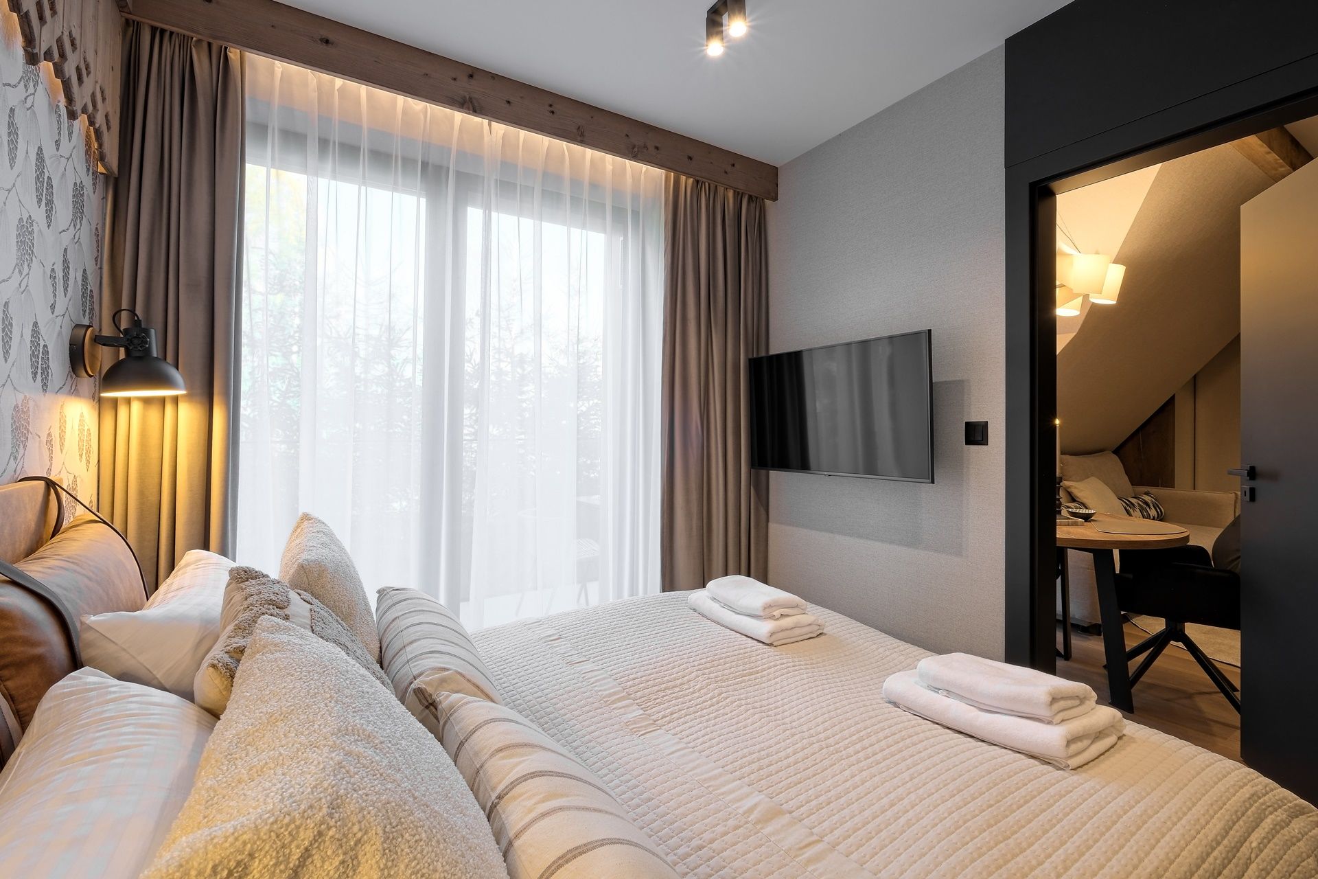 • Sypialnia: duże małżeńskie łóżko z nowoczesnym zagłówkiem, TV, biurkiem i stylowymi stolikami nocnymi – idealne miejsce do wyciszenia