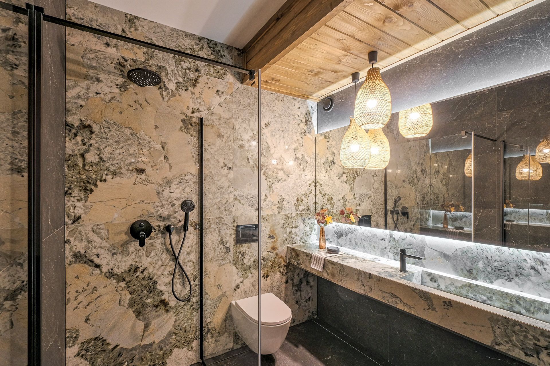 • Łazienka: designerskie wnętrze z czarnym kamieniem, kabiną typu walk-in z czarną armaturą, WC i umywalką