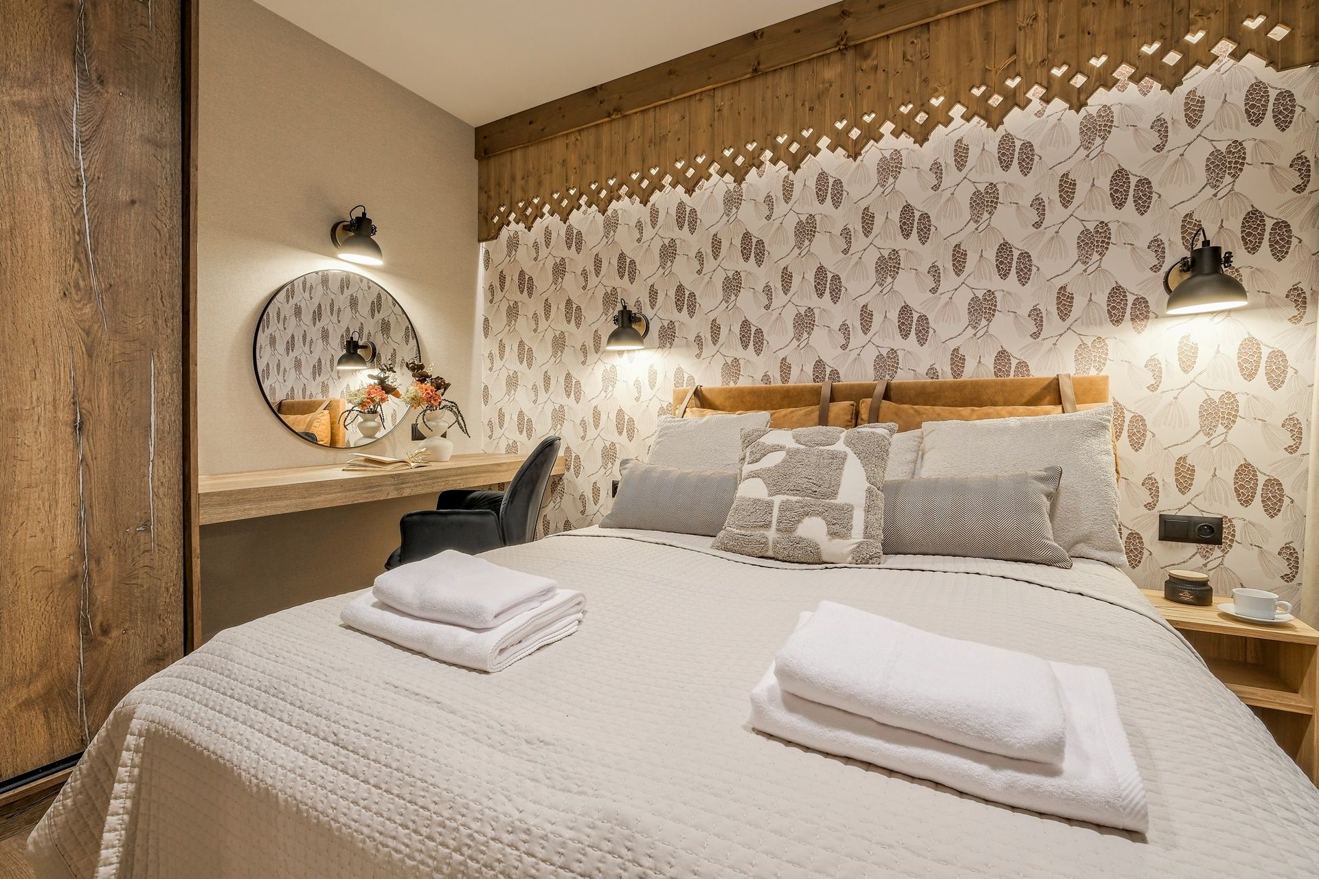 W sypialni dominują motywy inspirowane naturą – tapeta z rysunkiem szyszek, dekoracyjne drewniane wykończenia oraz miękka, warstwowa pościel zapewniają wrażenie przytulnego, górskiego azylu.