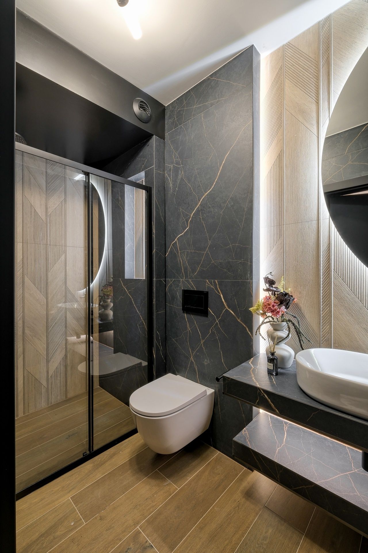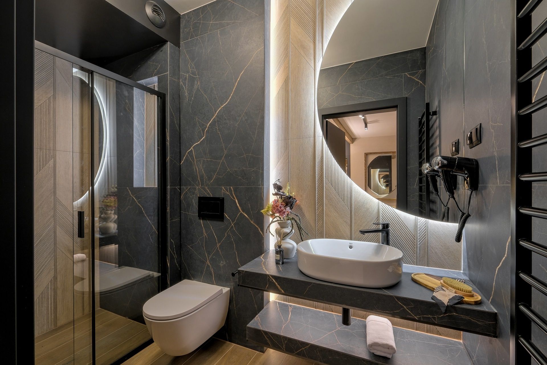 Łazienka to przestrzeń w standardzie premium – ciemne, kamienne wykończenia przełamane subtelnymi złotymi liniami, podświetlane lustro oraz armatura w czerni tworzą wyjątkowo elegancki charakter.